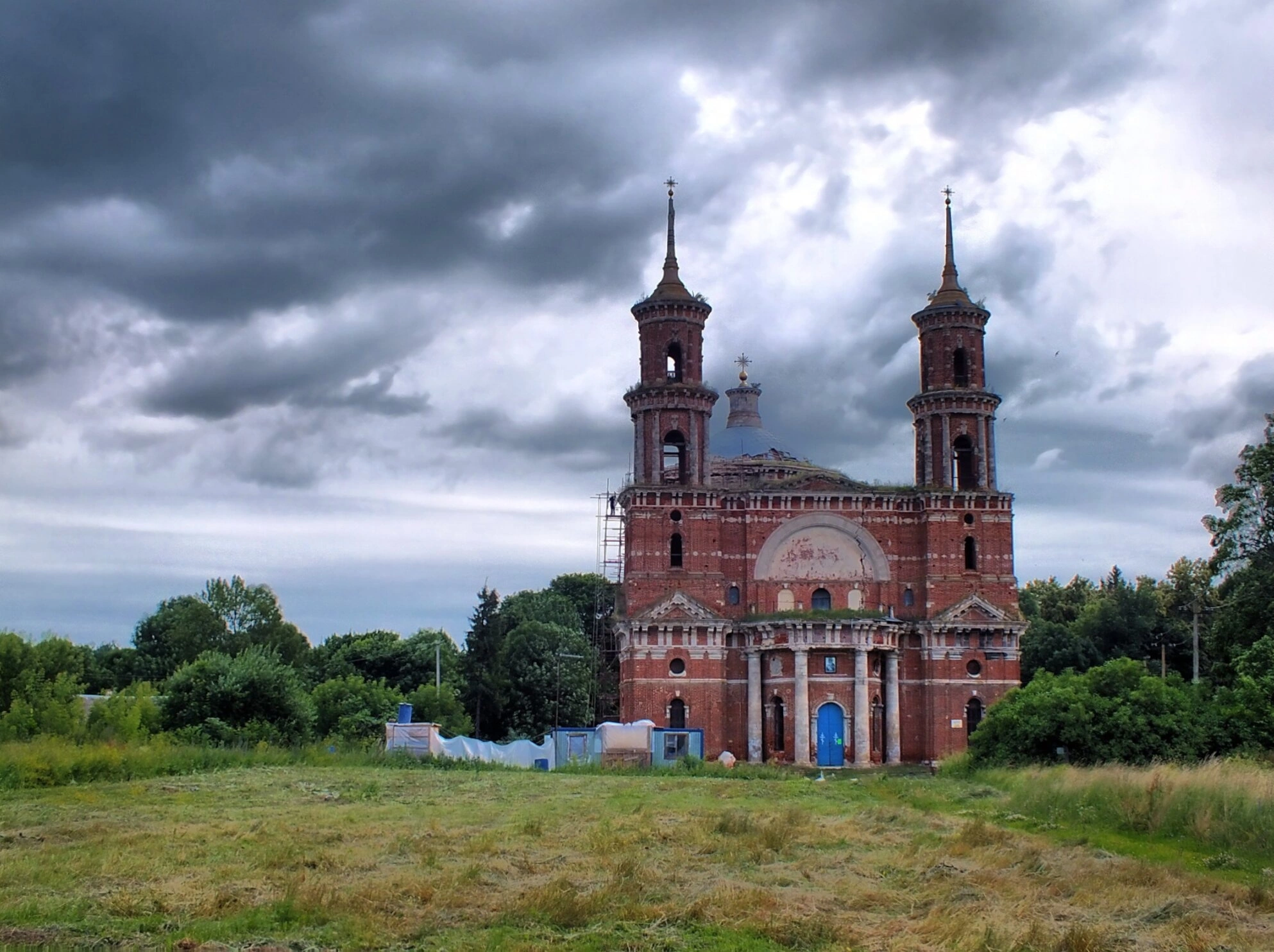 На представленной фотографии запечатлена Церковь Владимирской иконы Божией Матери, расположенная в селе Баловнево Данковского района Липецкой области. Этот величественный храм является выдающимся памятником русской церковной архитектуры конца XVIII века, созданным по проекту великого зодчего Василия Ивановича Баженова.