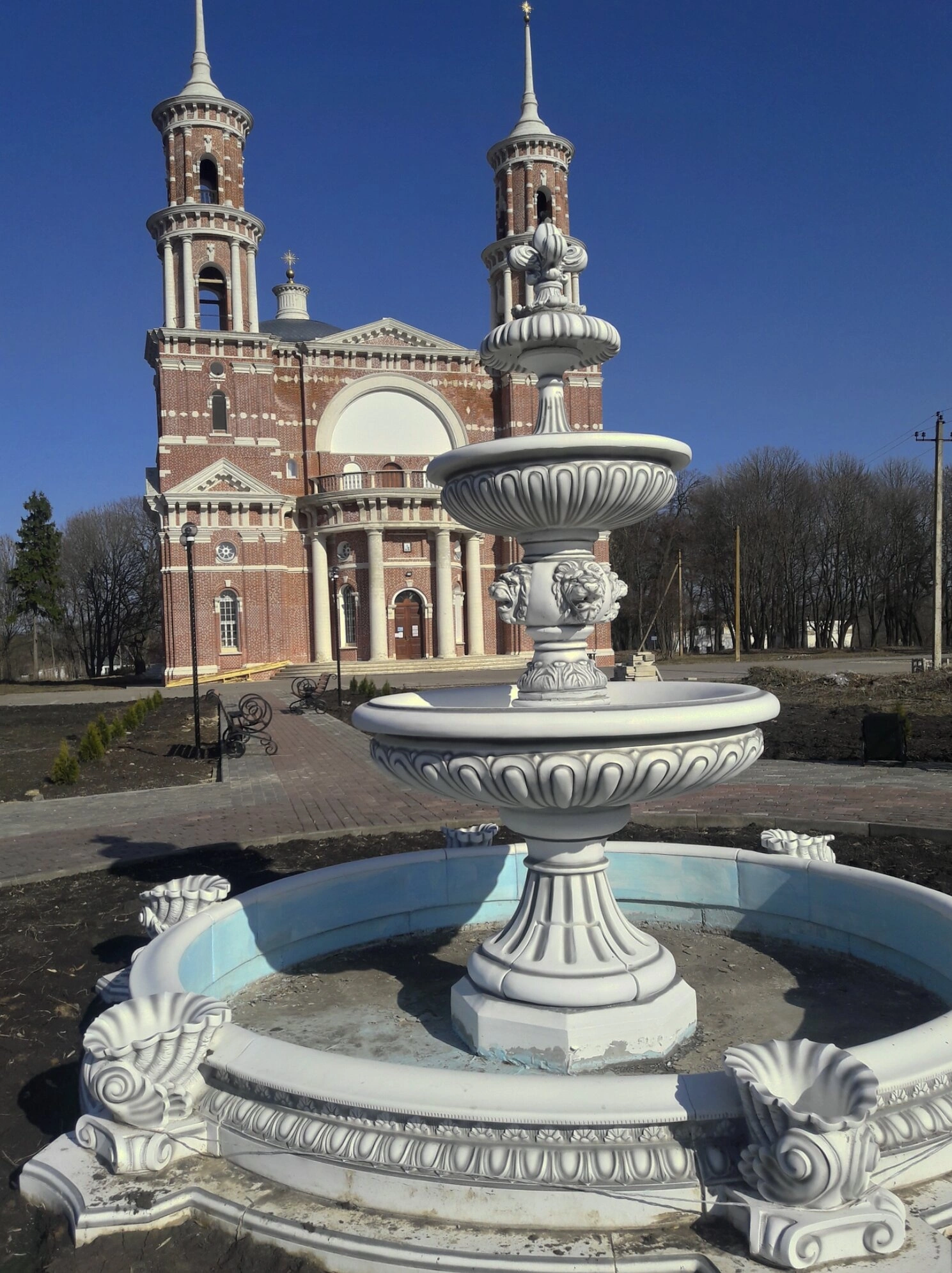 На переднем плане фотографии виден декоративный фонтан, являющийся частью благоустройства храмовой территории. Живописное окружение из деревьев подчёркивает гармоничное единство творения рук человеческих и природной красоты. Храм Владимирской иконы Божией Матери пережил годы запустения в советский период, но в настоящее время постепенно возрождается силами верующих и реставраторов, возвращая былое величие одной из духовных жемчужин Липецкой земли.