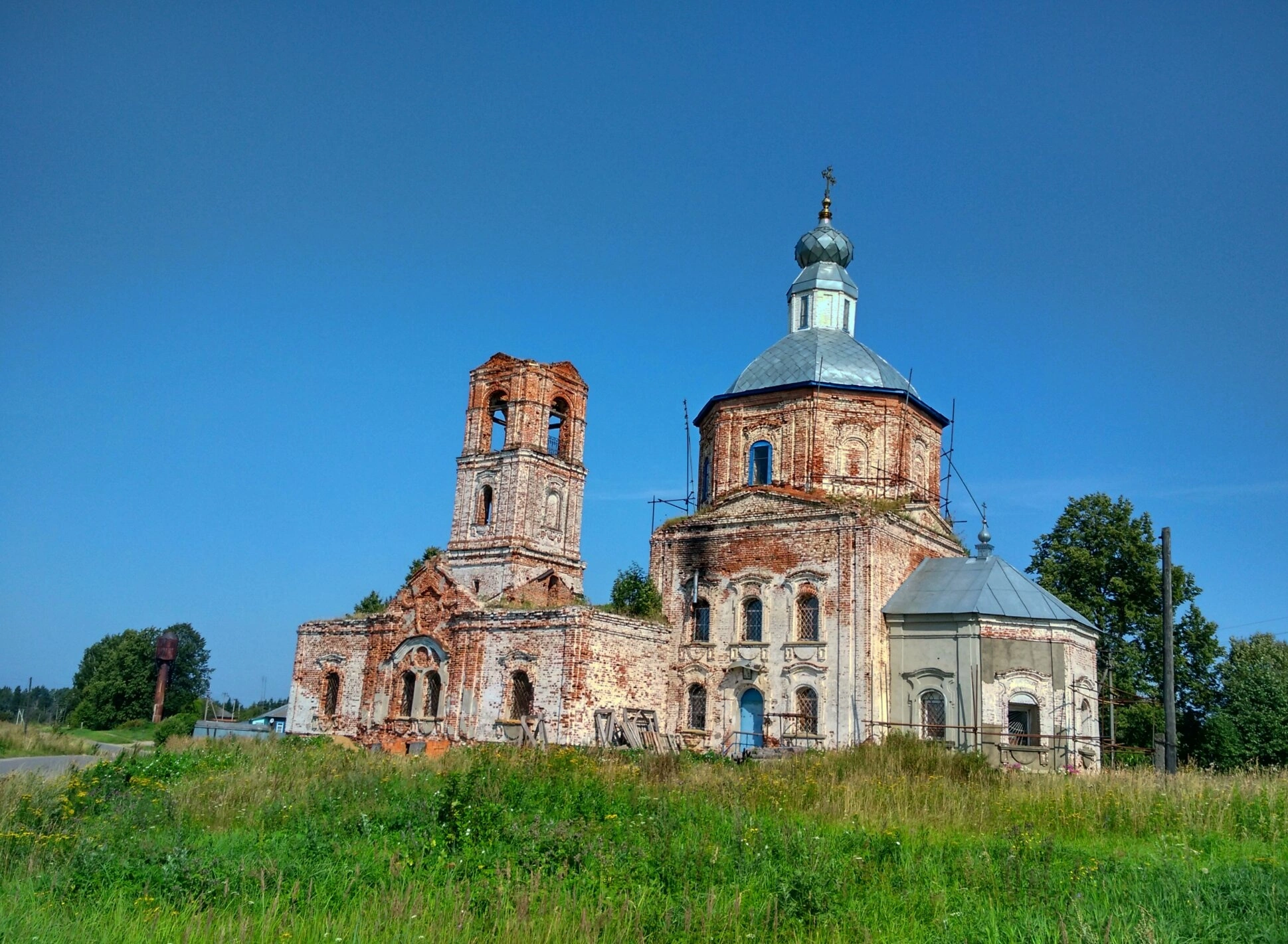 Фотография позволяет оценить гармоничные пропорции храма, его удачное расположение в природном ландшафте и особенности внешнего убранства, характерные для церковного зодчества Центральной России периода барокко с элементами традиционного русского узорочья.