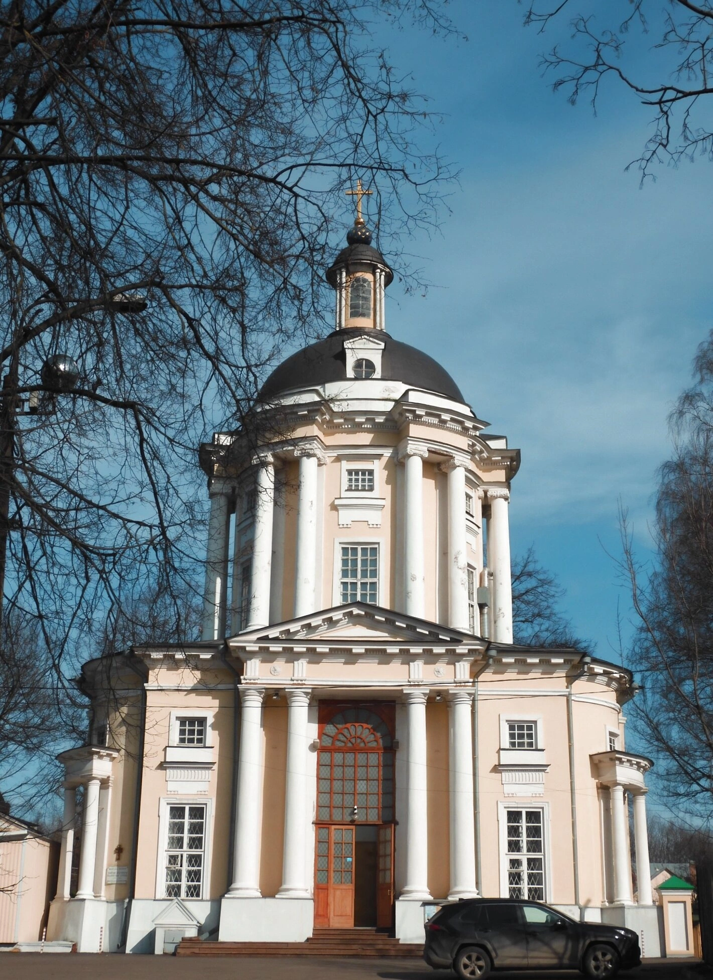 На снимке хорошо просматривается светло-желтый окрас стен храма, который эффектно сочетается с белоснежными элементами декора: пилястрами, карнизами, наличниками и фронтонами. Купол окрашен в зелёный цвет и завершается золочёной главкой с крестом. Вокруг церкви виден зимний пейзаж: голые деревья и снежный покров, что придаёт фотографии особое настроение умиротворения и строгой красоты. Несмотря на присутствие в кадре элементов современности, таких как автомобиль на переднем плане, атмосфера святого места остаётся неизменной.