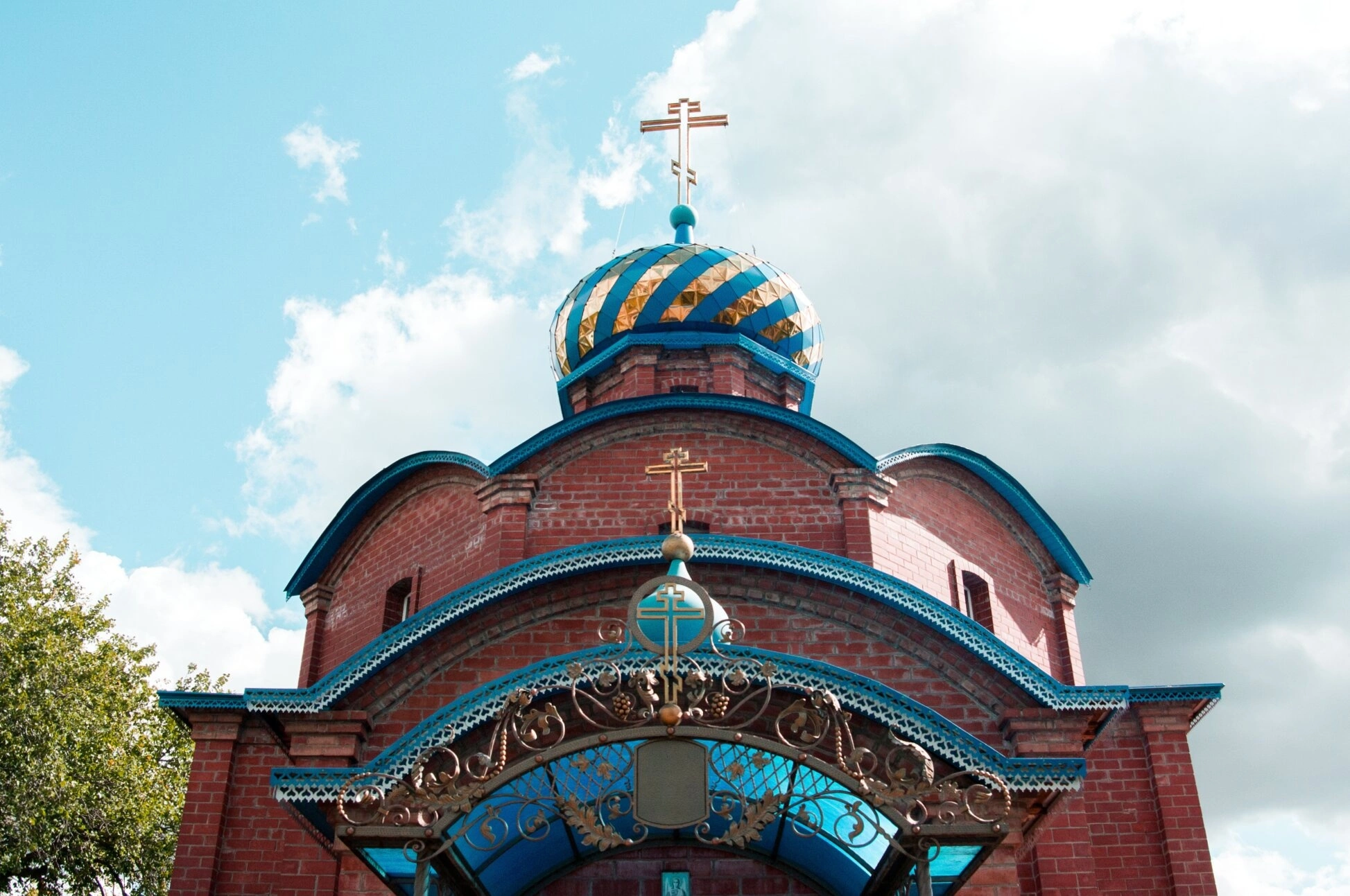 Центральным элементом композиции выступает величественный синий купол, увенчанный золочёным православным крестом. Небесный цвет символизирует чистоту и божественную благодать, а золотые полосы, обрамляющие барабан купола, подчёркивают сакральное значение этого места. Над арочным входом в храм внимание приковывает изящно выполненный киот, также окрашенный в лазурный цвет и украшенный позолоченными орнаментами, который завершается малым крестом.