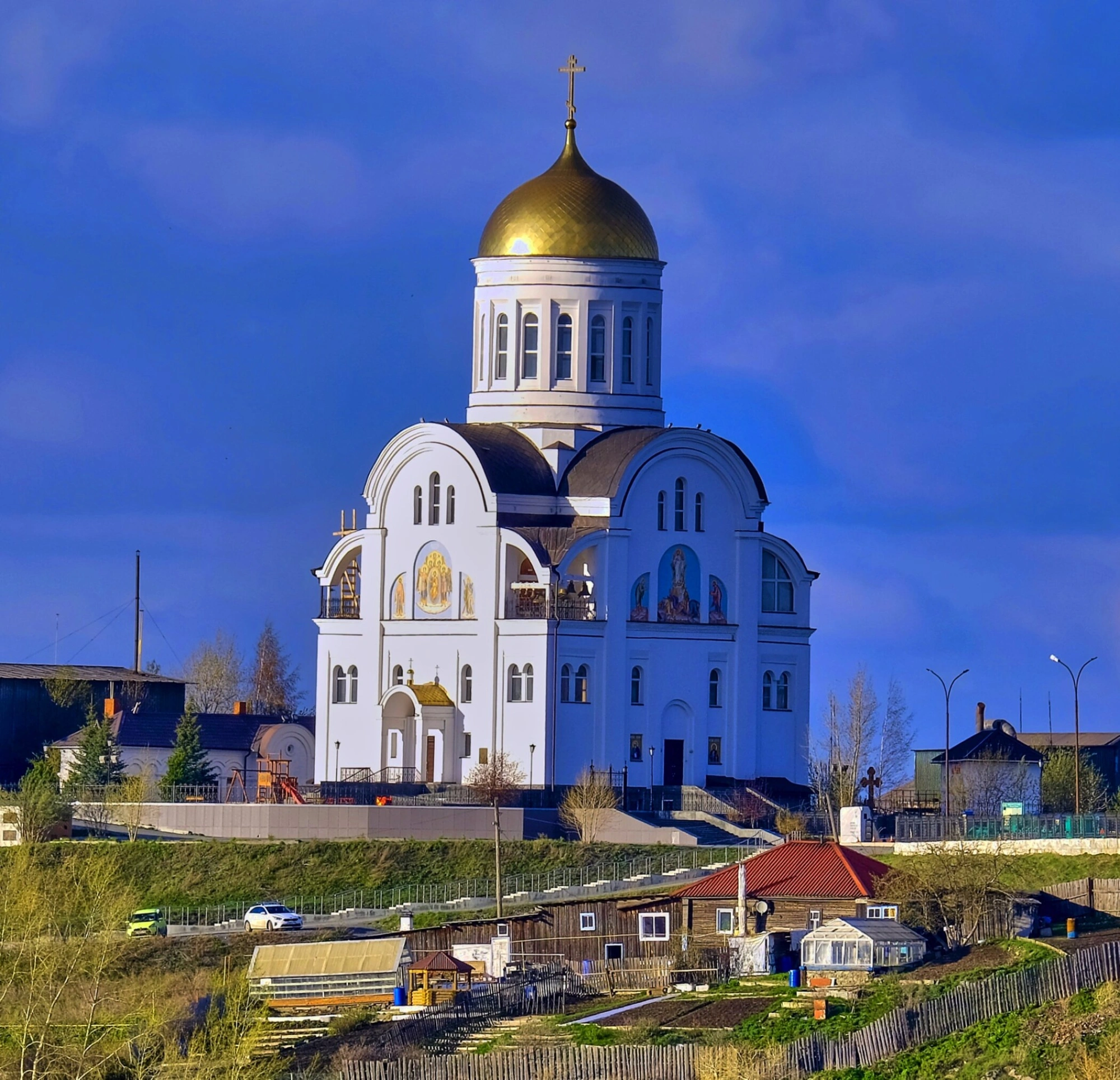 На представленной фотографии запечатлён воссозданный храм во имя Архистратига Божия Михаила, возвышающийся на живописном холме в городе Ревда Свердловской области. Святыня, сияющая белоснежными стенами и златоверхим куполом, увенчанным животворящим крестом, является духовным центром города и образцом традиционного русского церковного зодчества.