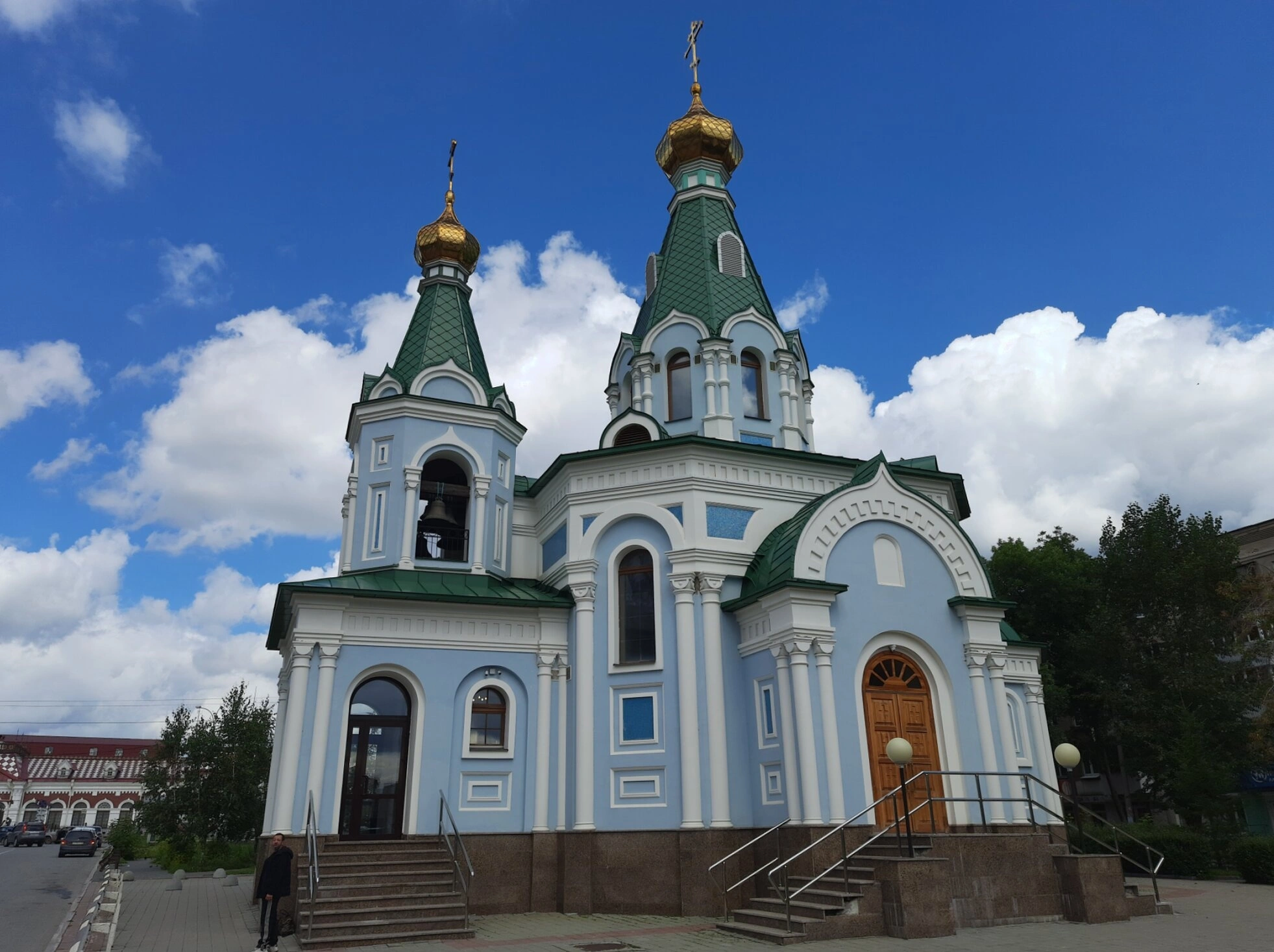Храм стоит под сенью ясного голубого неба с кучевыми облаками, что придаёт фотографии особое благостное настроение. С правой стороны от святыни виднеются кроны деревьев, а с левой — часть городской застройки, что подчёркивает гармоничное вписывание дома Божия в окружающий мир. Данный храмовый комплекс был построен и освящён в начале XXI века, став одним из значимых духовных центров города. Его возведение связано с почитанием Державной иконы Пресвятой Богородицы, явившейся в день отречения от престола государя императора Николая II, что имеет глубокий символический смысл для Уральской земли.