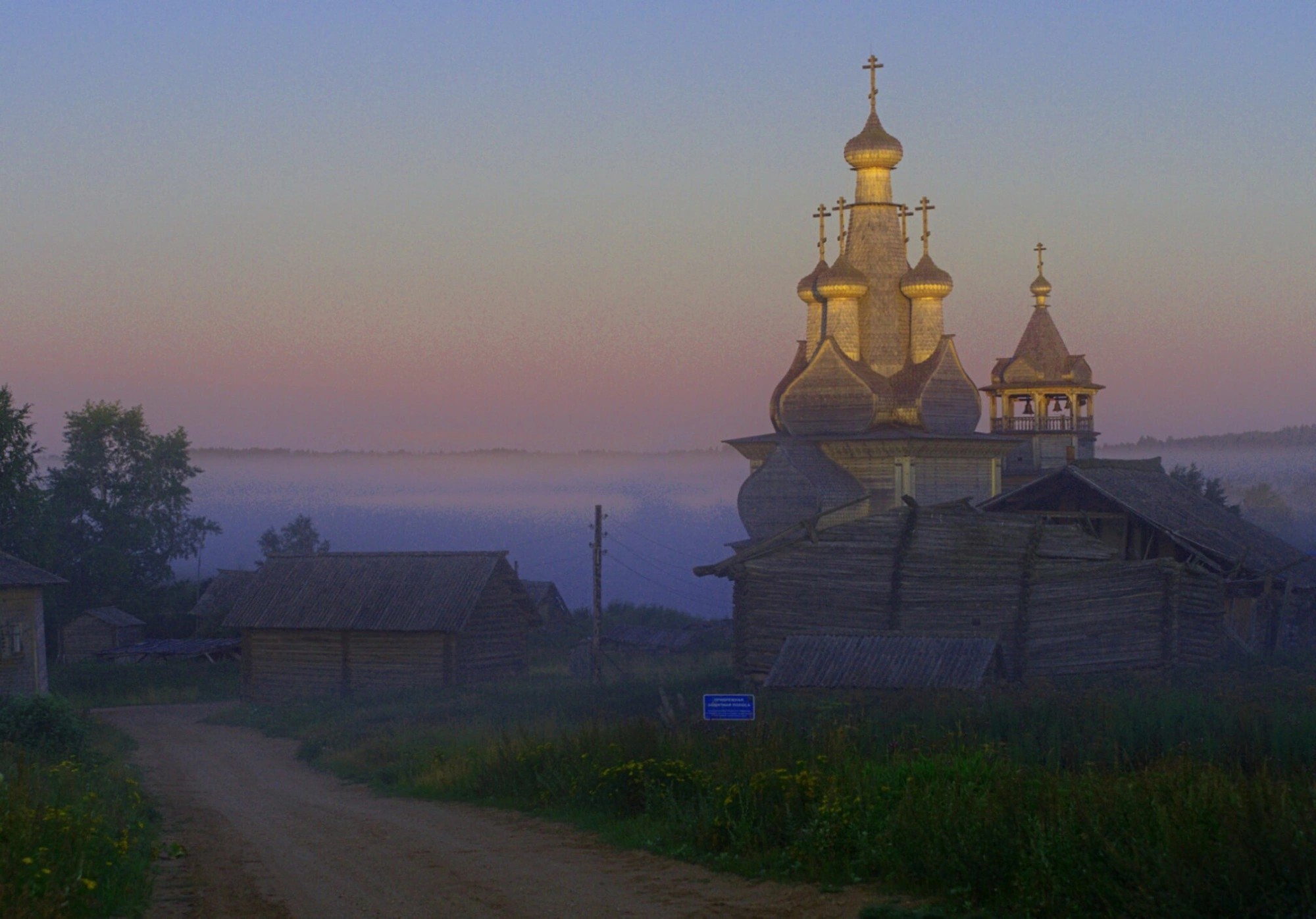 На фотографии запечатлён уникальный памятник федерального значения — деревянная шатровая церковь во имя иконы Божией Матери «Одигитрия», возведённая в 1709 году в древнем поморском селе Кимжа Мезенского района Архангельской области. Храм, изображённый в лучах рассветного солнца, парит над тихой деревенской улицей, устланной грунтовой дорогой, и окружающим его пейзажем, создавая возвышенный и благоговейный образ.