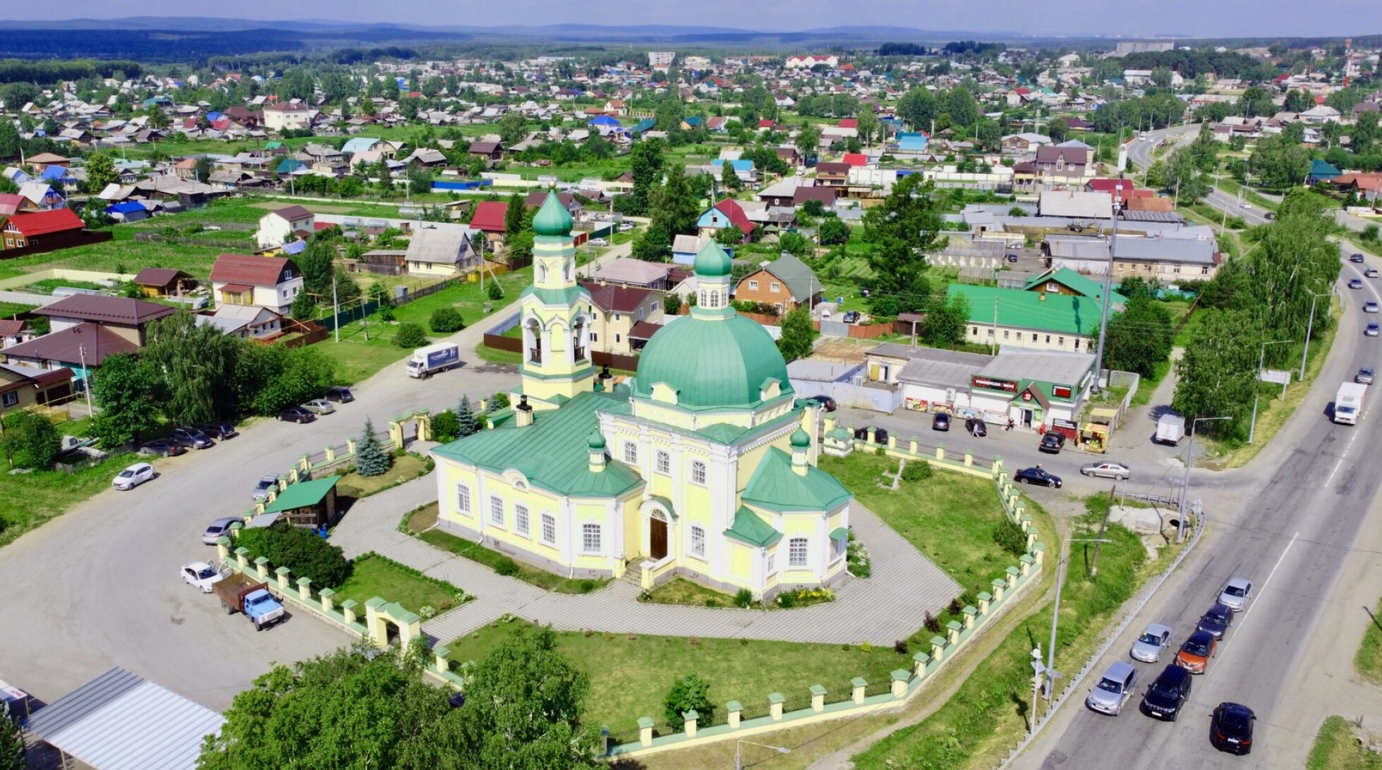 На представленной фотографии запечатлён храм во имя святителя Николая Чудотворца, расположенный в старинном уральском селе Николо-Павловское, что в Свердловской области. Этот православный храм является духовным центром села и архитектурной доминантой, хорошо узнаваемой благодаря своим нарядным зелёным куполам, увенчанным златоглавыми крестами, и высокой стройной колокольне.