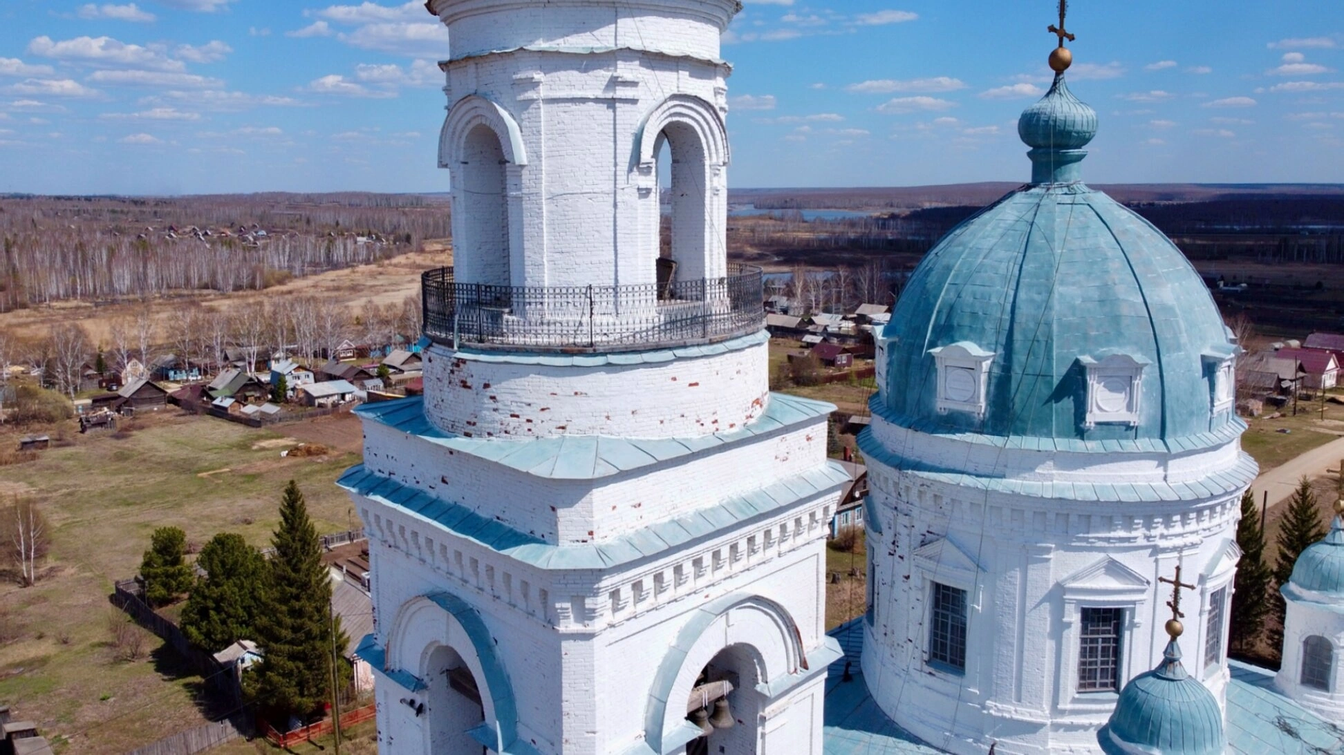 Яркий бирюзовый цвет кровли и купола создаёт выразительный контраст со светлыми стенами, символизируя устремлённость от земного к небесному. Храм гармонично вписан в окружающий сельский пейзаж: за ним виднеются скромные дома, утопающие в зелени деревьев, а на дальнем плане простираются бескрайние уральские леса. Фотография сделана в ясный солнечный день, и естественное освещение мягко подчеркивает все детали благолепного убранства и окружающей природы, создавая атмосферу благодати и умиротворения.