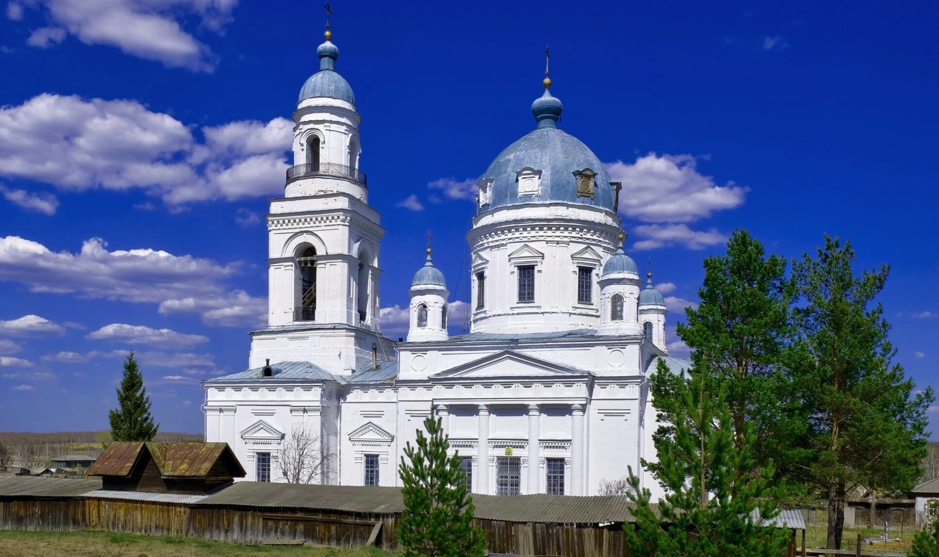 Церковь расположена в живописной сельской местности, что подчёркивает гармонию божественного творения и природной красоты уральской земли. Снимок передаёт атмосферу мира и покоя, свойственную этому святому месту.