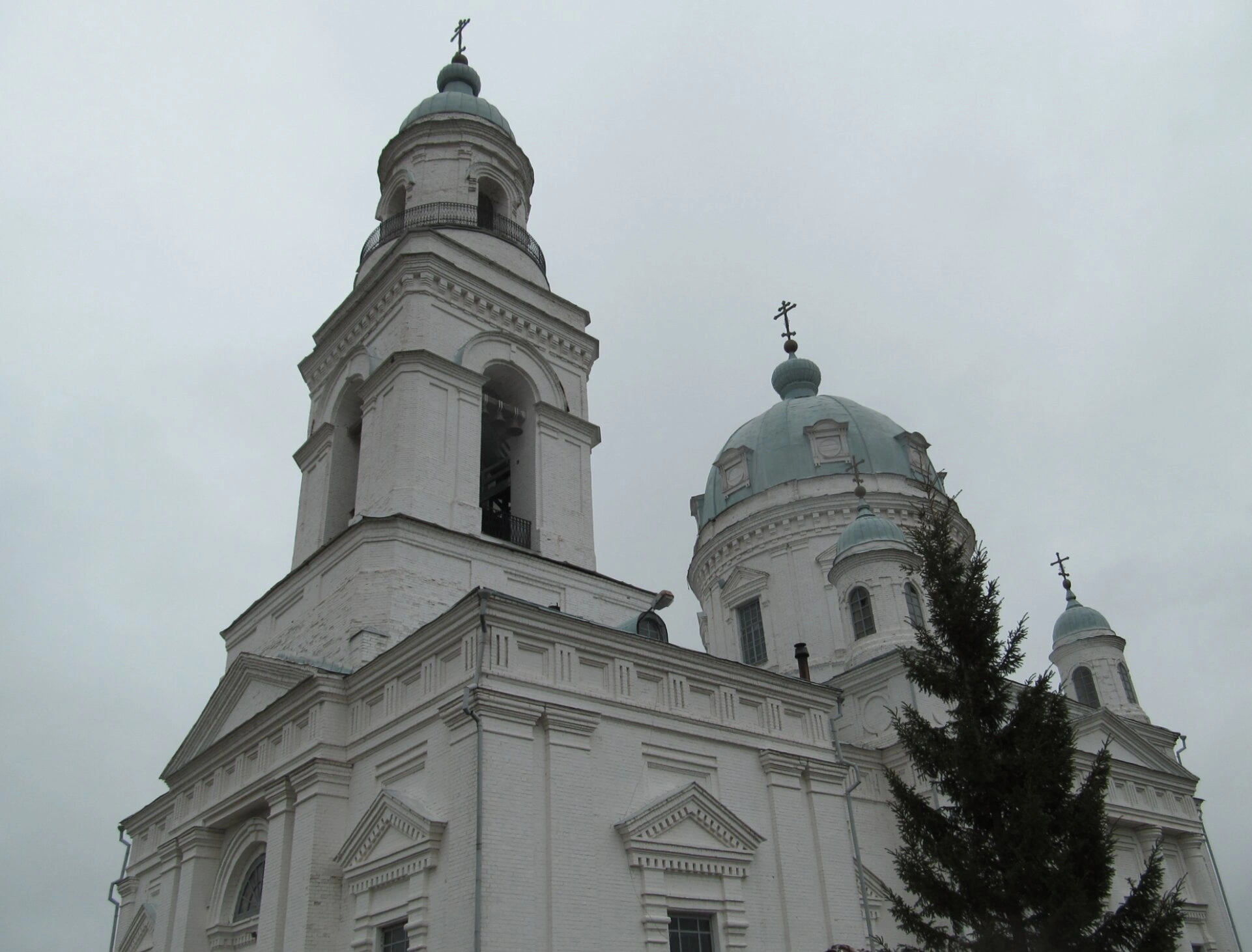 Белоснежные стены храма, контрастирующие с пасмурным небом на фотографии, символизируют чистоту и духовную благодать. Кресты на куполах, устремлённые в небо, напоминают о молитвенном предстоянии перед Господом. На снимке также видна часть хвойного дерева, что подчёркивает гармоничное единение творения рук человеческих и божественной природы.