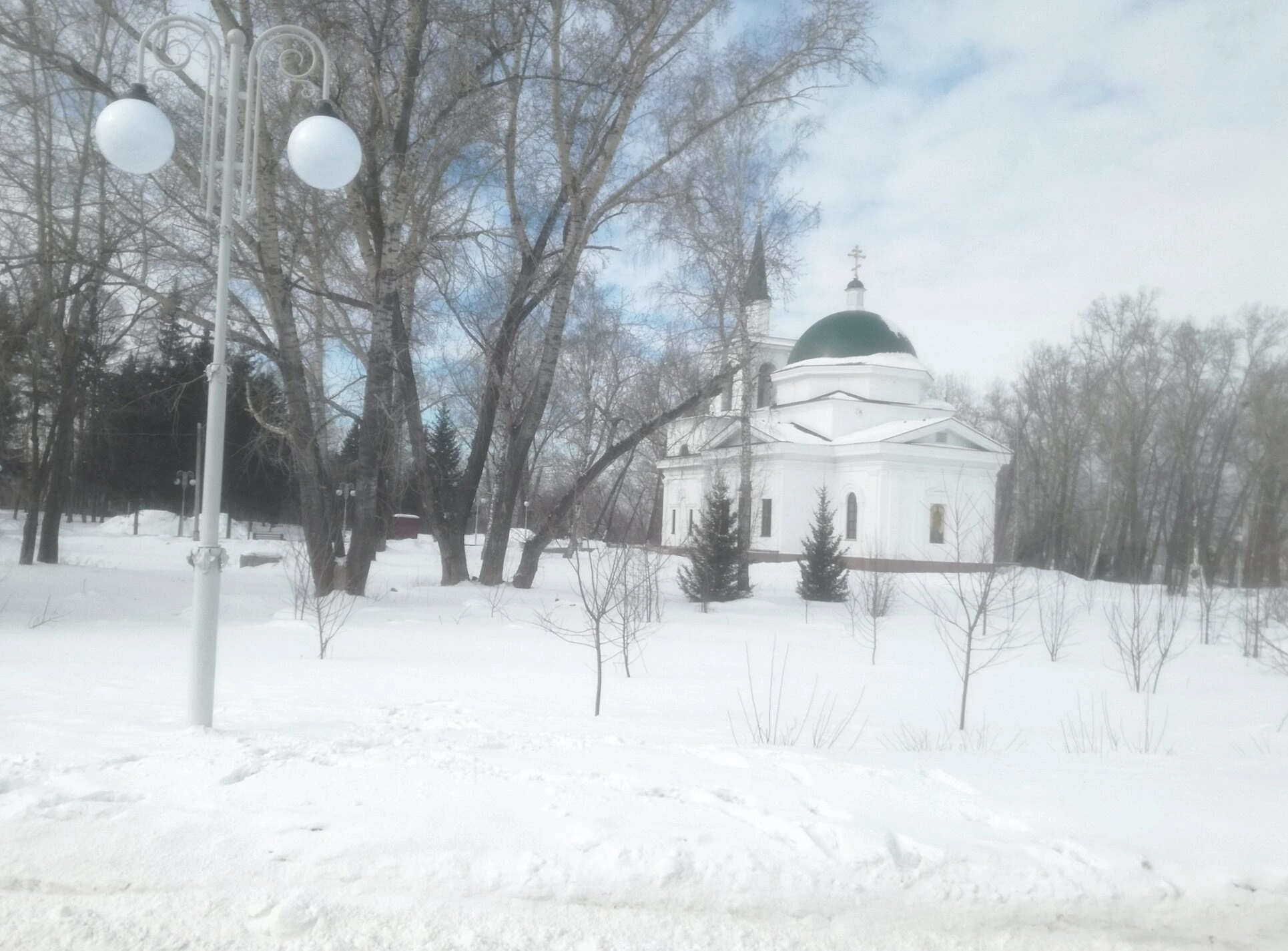 Зимний пейзаж придаёт месту особую тишину и умиротворённость. Чистый снег покрывает землю и ветви деревьев, подчёркивая уединённость и духовную сосредоточенность храма. На переднем плане виден уличный фонарь, что указывает на благоустроенность территории. В зимние дни храм становится особенно притягательным местом для горожан, ищущих уединённой молитвы и созерцания красоты Божьего мира.
