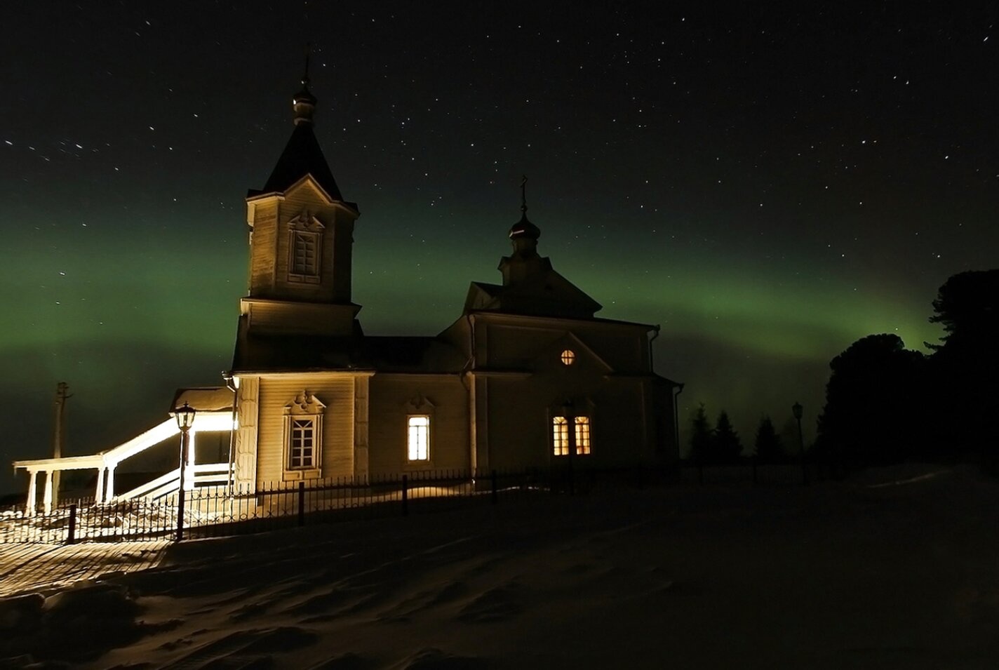 На представленной фотографии запечатлён православный храм во имя святого великомученика и целителя Пантелеимона, расположенный в селе Тундрино Сургутского района Ханты-Мансийского автономного округа – Югры. Данный священный объект является значимым памятником культурного наследия региона и духовным центром для местных жителей.