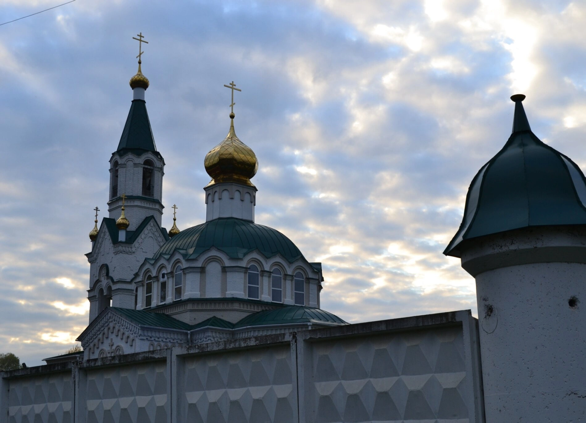 Часть церковной территории обнесена оградой, что является традиционной практикой для православных монастырей и храмовых комплексов. Справа на переднем плане можно наблюдать часть вспомогательной церковной постройки, возможно, колокольни или часовни, также увенчанной зелёным куполом с крестом. Облачное небо на заднем плане добавляет снимку драматизма и подчёркивает монументальность каменного сооружения.