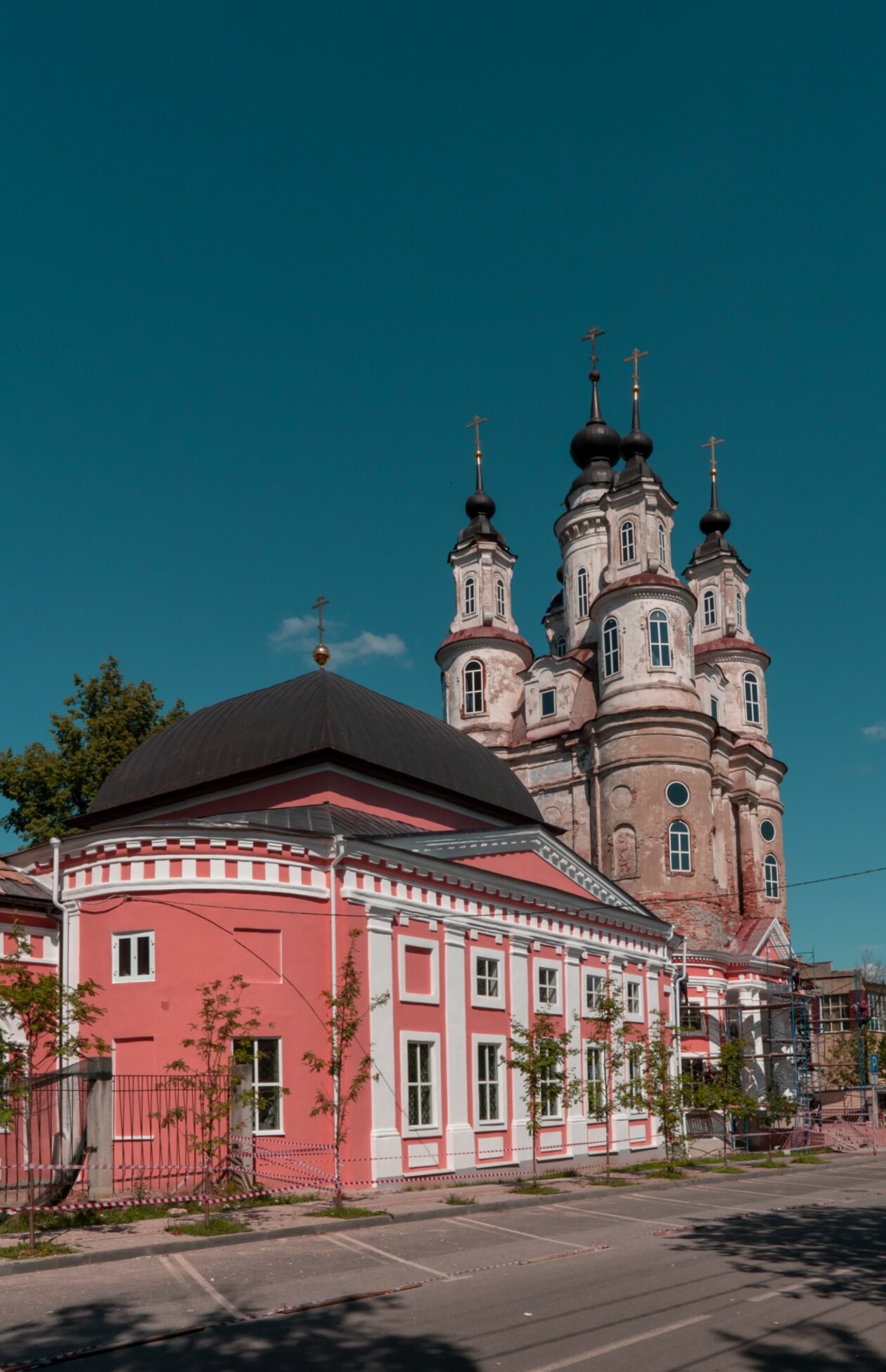Храм окружает спокойный городской пейзаж: зелёные кроны деревьев, ограда и благоустроенная территория. Ясное голубое небо, занимающее значительную часть кадра, подчёркивает величие православной святыни и создаёт настроение благодати и мира. Здание храма, обласканное солнечным светом, выглядит ухоженным и готовым к принятию верующих, что свидетельствует о его действующем статусе.