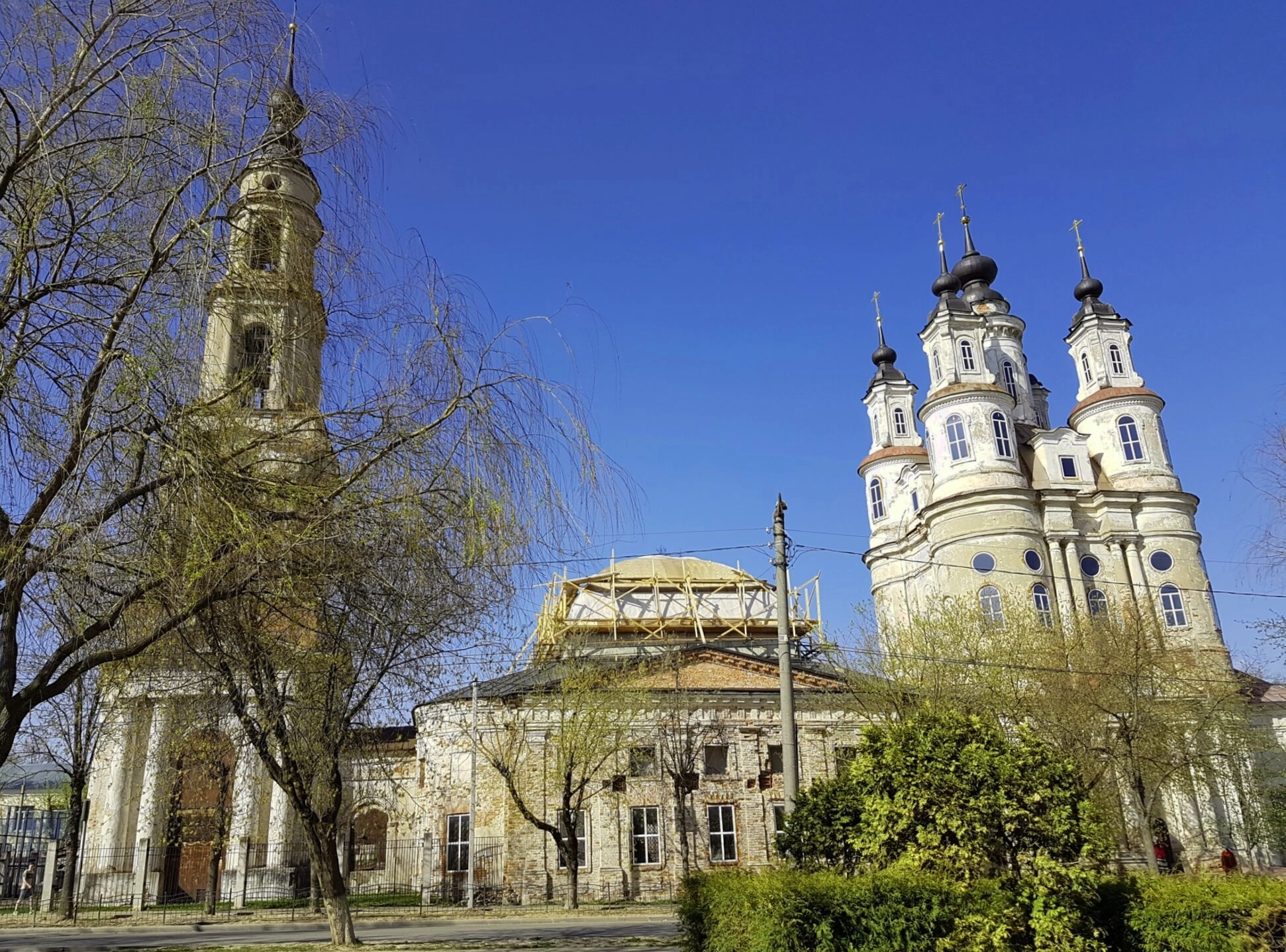 Центральное место на фотографии занимает сам храм, чья архитектура восходит к лучшим традициям русского барокко середины XVIII века. Устремлённые ввысь округлые барабаны, увенчанные золочёными главками с крестами, создают праздничный и торжественный облик. Левее основного объёма возносится к небу многоярусная колокольня, являющаяся неотъемлемой частью целостного архитектурного замысла. Важно отметить, что на момент съёмки храм находился под попечением реставраторов — строительные леса вокруг одного из куполов свидетельствуют о непрестанных трудах по сохранению этого духовного и культурного достояния.