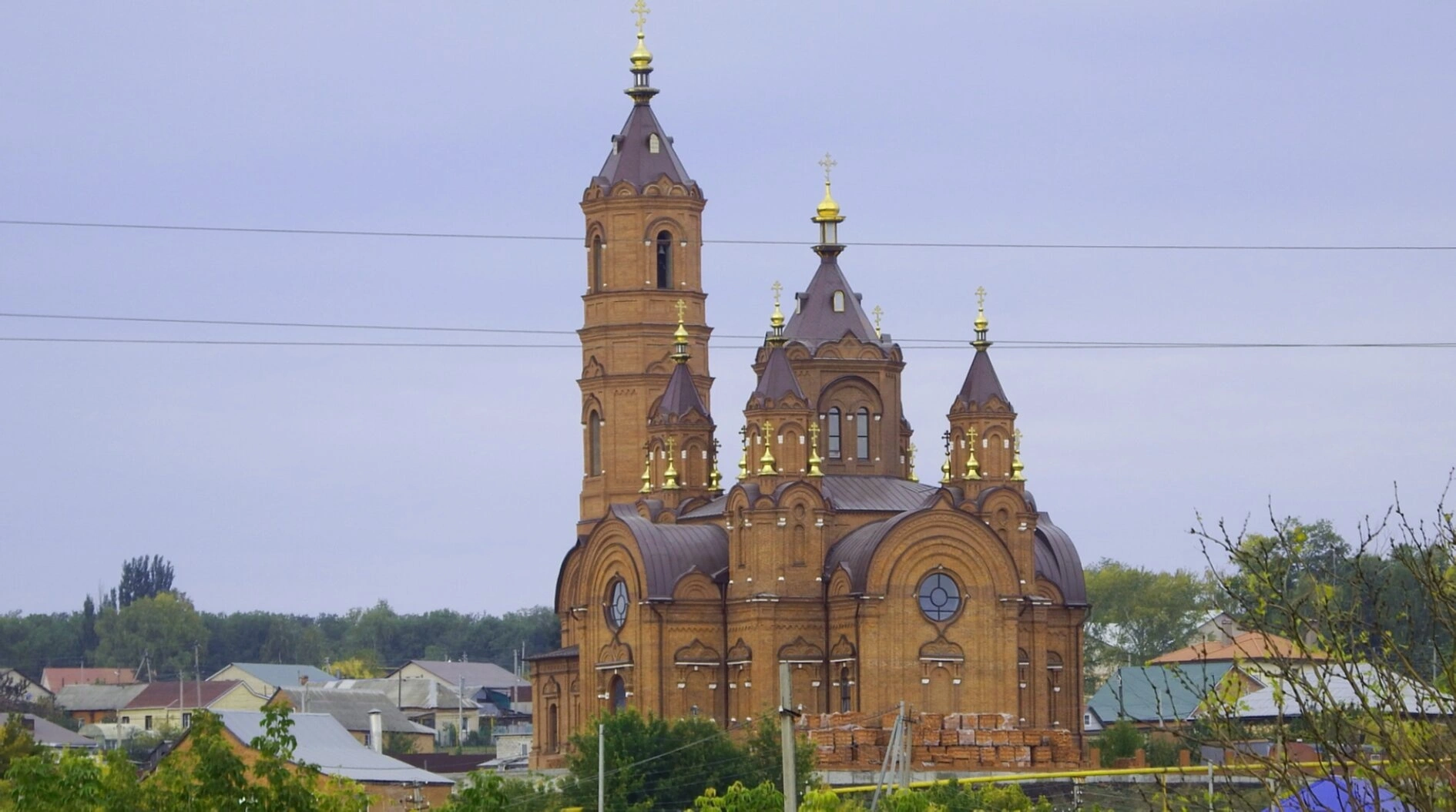 На фотографии хорошо просматриваются характерные элементы православного храмостроительства: апсида, главный купол, а также детали кирпичного декора. На заднем плане виднеются жилые дома села и окружающие поля, что подчёркивает сельское расположение святыни и её особый статус в духовной жизни всего района.