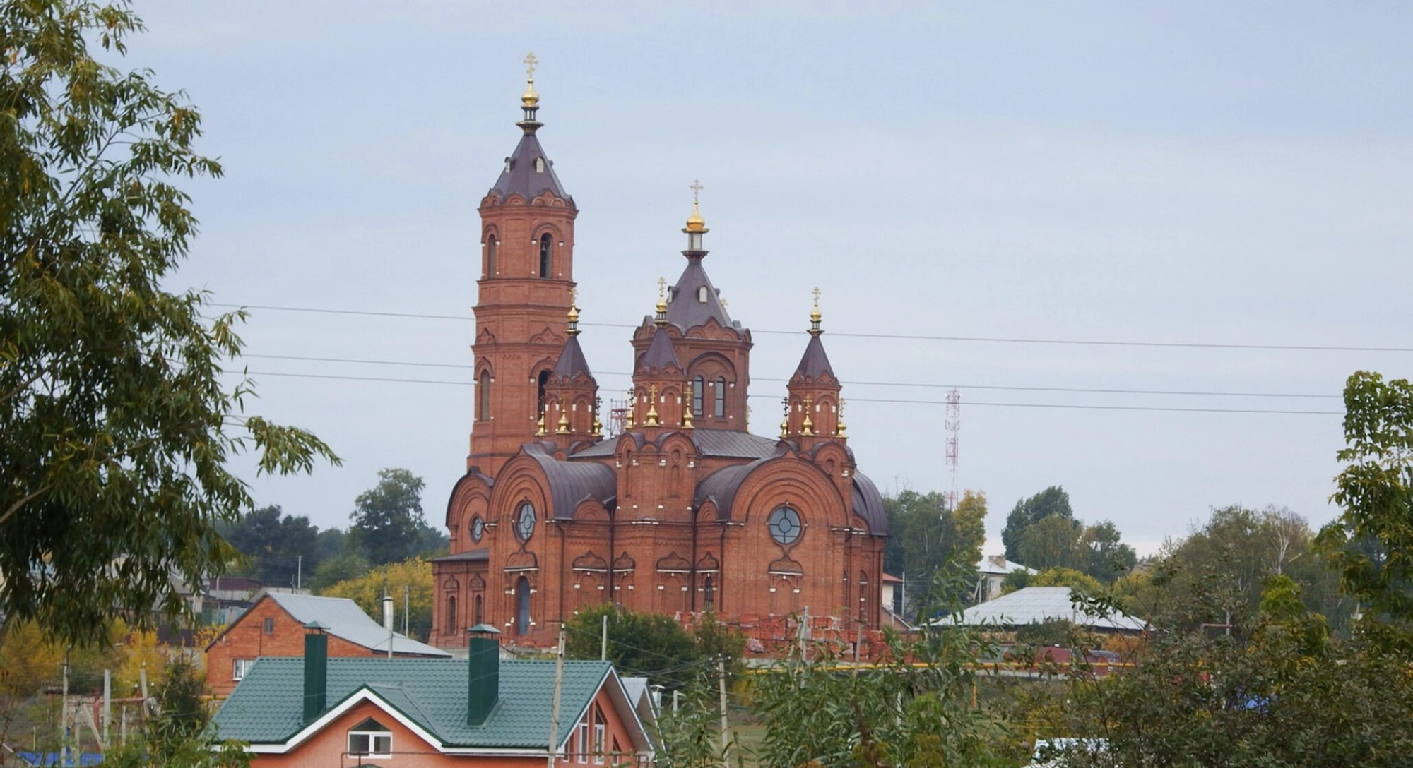 Снимок передаёт не только архитектурные детали храма — кокошники, арочные окна, кирпичный декор, — но и его особое местоположение. Открывающийся с холма вид на окрестные дома и деревья подчёркивает неразрывную связь святыни с жизнью простого народа, которому она служит многие десятилетия. Фотография позволяет оценить масштаб и красоту этого православного памятника, привлекающего внимание паломников и ценителей церковной старины.