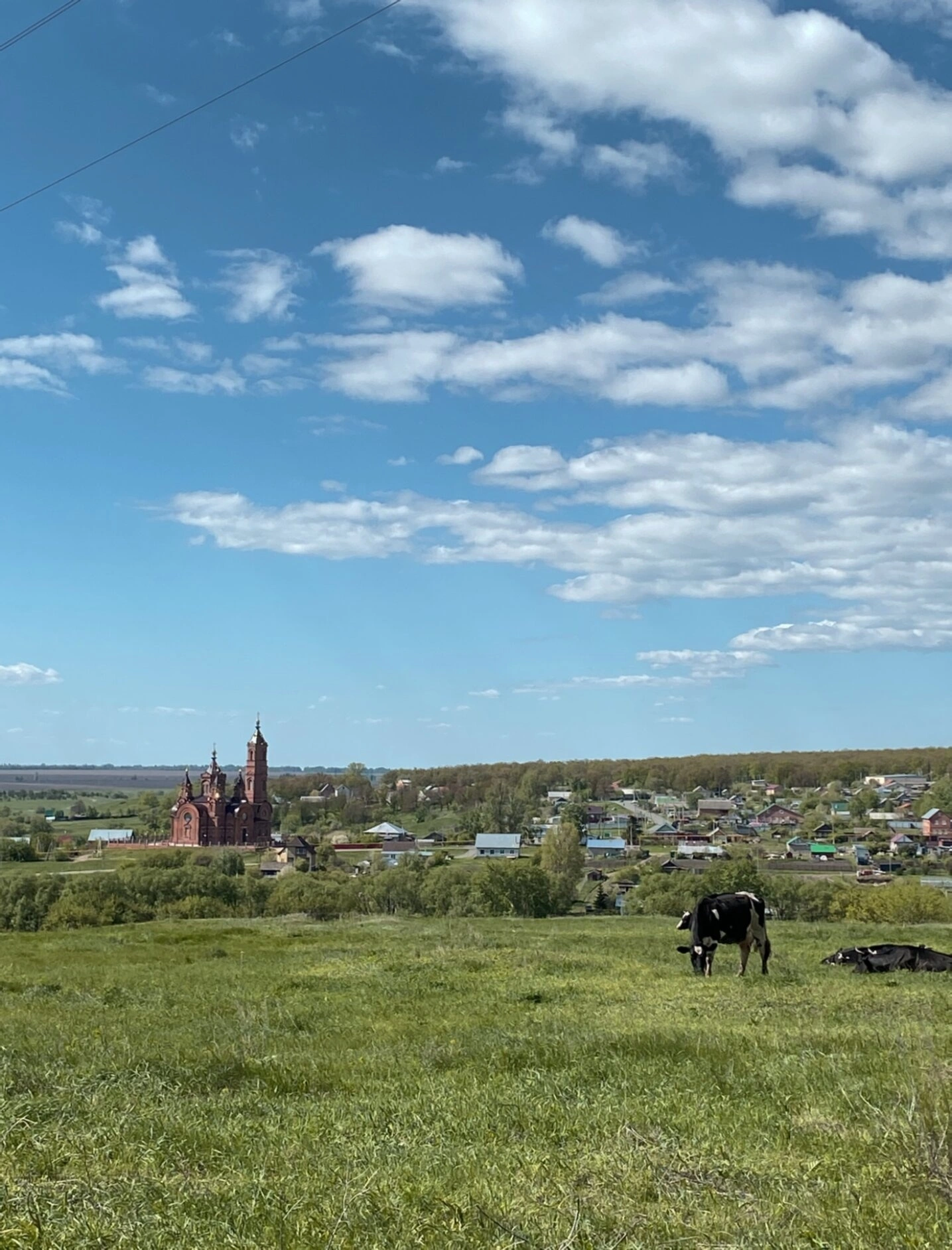 Церковное здание выполнено из красного кирпича в традициях русского стиля, характерного для церковного зодчества конца XIX – начала XX века. Архитектурный облик храма отличается строгостью форм и гармонией пропорций, что создает возвышенное молитвенное настроение. На переднем плане фотографии виден ухоженный луг, где мирно пасутся животные, что символизирует единство Божьего творения.