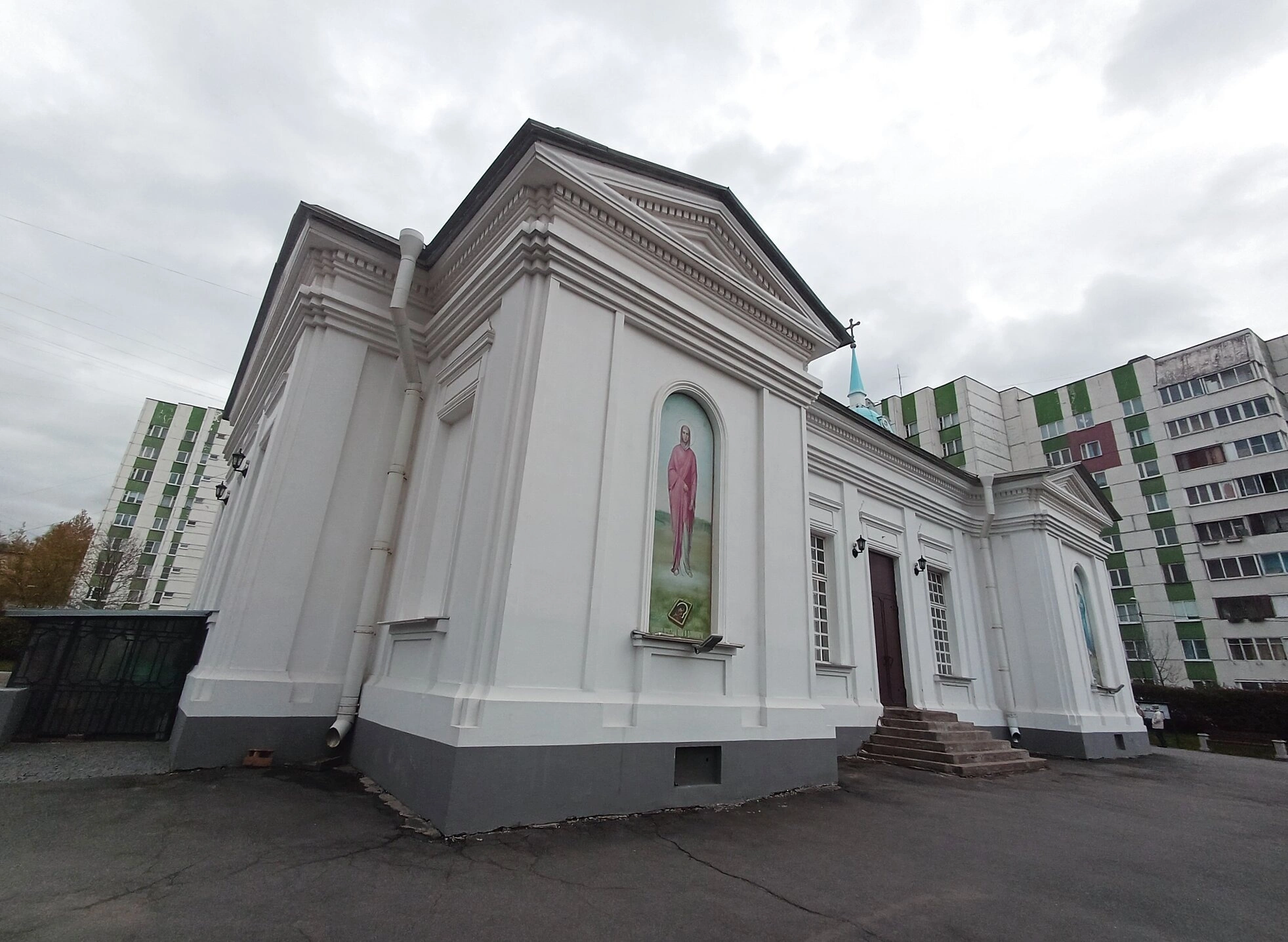 На заднем плане фотографии видны современные многоэтажные жилые дома, что подчёркивает уникальность существования православной святыни в условиях динамичной городской среды. Пасмурное небо с облаками добавляет кадру особое настроение, напоминая о вечном и непреходящем. Данный храм является важным духовным центром для верующих, посвящённым памяти святых мучениц, пострадавших за веру во Христа.