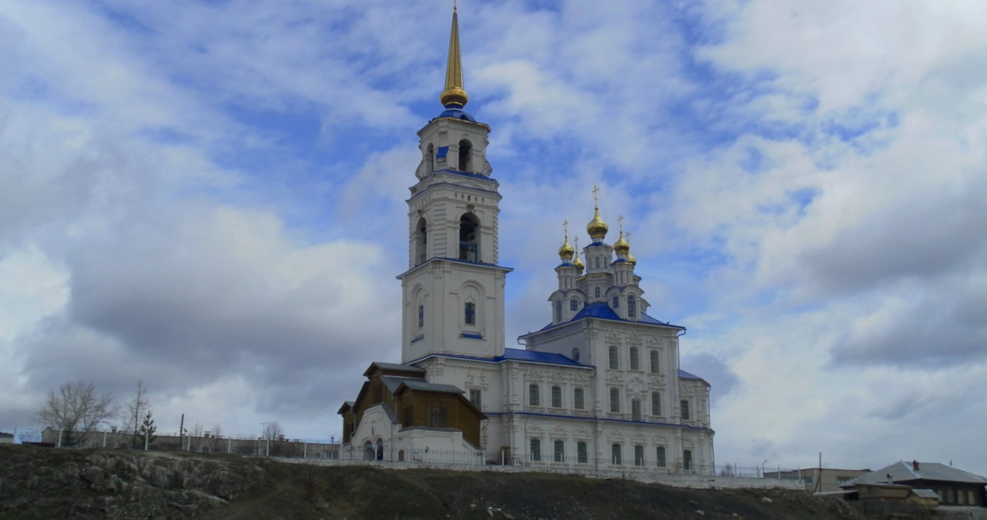 На фотографии храм предстаёт в своём величественном виде, окружённый скромным уральским пейзажем. На заднем плане виднеется небо с облаками, а у подножия холма — элементы скромной городской застройки. Фотография передаёт не только архитектурные details храма, но и его особое место в ландшафте и жизни города, являясь важным историческим и культурным свидетельством.