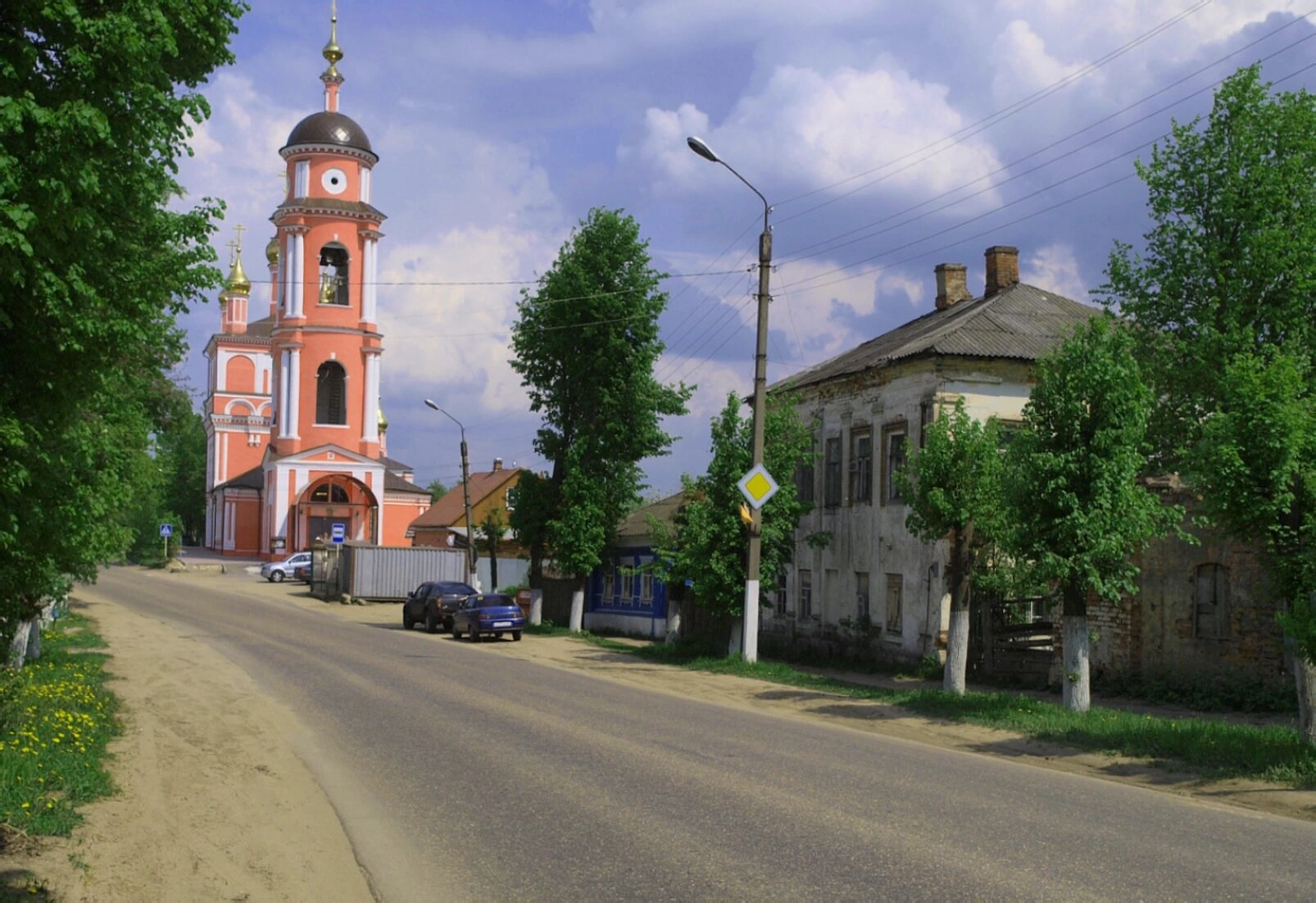 Снимок передаёт умиротворённую атмосферу провинциального русского города. Зелёные насаждения вдоль дороги обрамляют вид на святыню. На переднем плане видна часть старинной городской застройки, включая двухэтажное каменное здание, что подчёркивает исторический контекст и органичное вплетение храма в городской ландшафт. Церковь освящена в честь первых русских святых, благоверных князей Бориса и Глеба, невинно убиенных, что придаёт месту особую благодатную значимость и привлекает паломников.