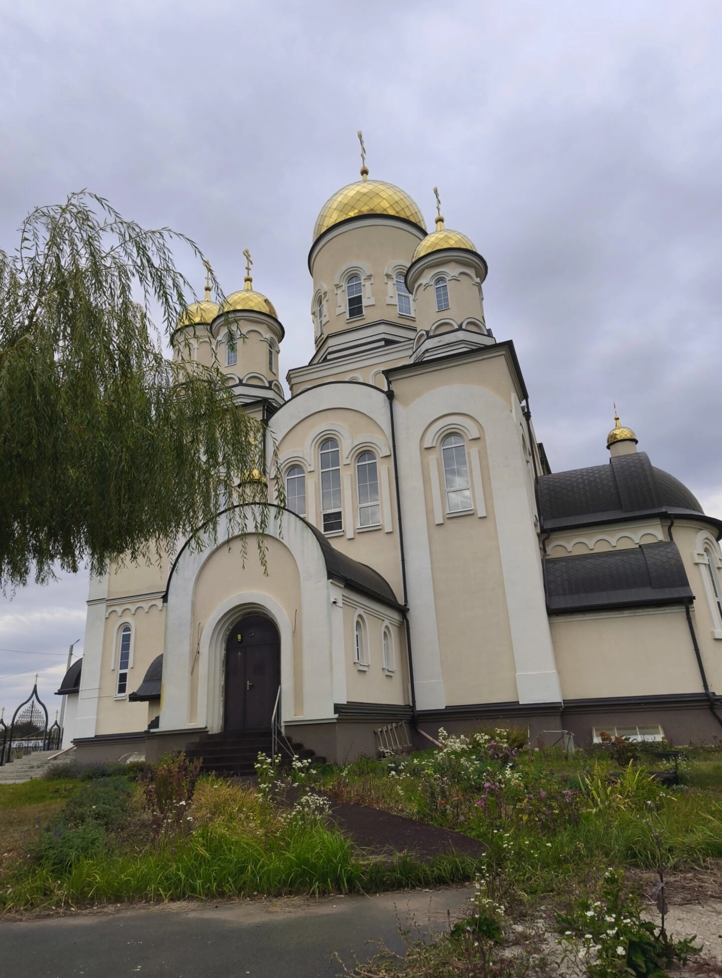Строительство нового каменного храма, который мы видим на фотографии, началось в 2006 году по проекту архитектора Вячеслава Владимировича Пешкова. На снимке зафиксирован важный этап в жизни прихода — в 2016 году, на Святую Пасху, верующие смогли перейти для молитвы из старого молитвенного дома в это великолепное новое здание. Фотография передаёт не только архитектурные формы, но и окружающую обстановку: неухоженную территорию на переднем плане, плакучее дерево слева, что говорит о периоде становления и благоукрашения храма, который продолжается и по сей день силами настоятеля протоиерея Михаила Антипова и прихожан. На фотографии люди крупным планом отсутствуют, что позволяет в полной мере сосредоточить внимание на благолепии архитектуры храма-новодела, возрождающего духовную жизнь в селе.