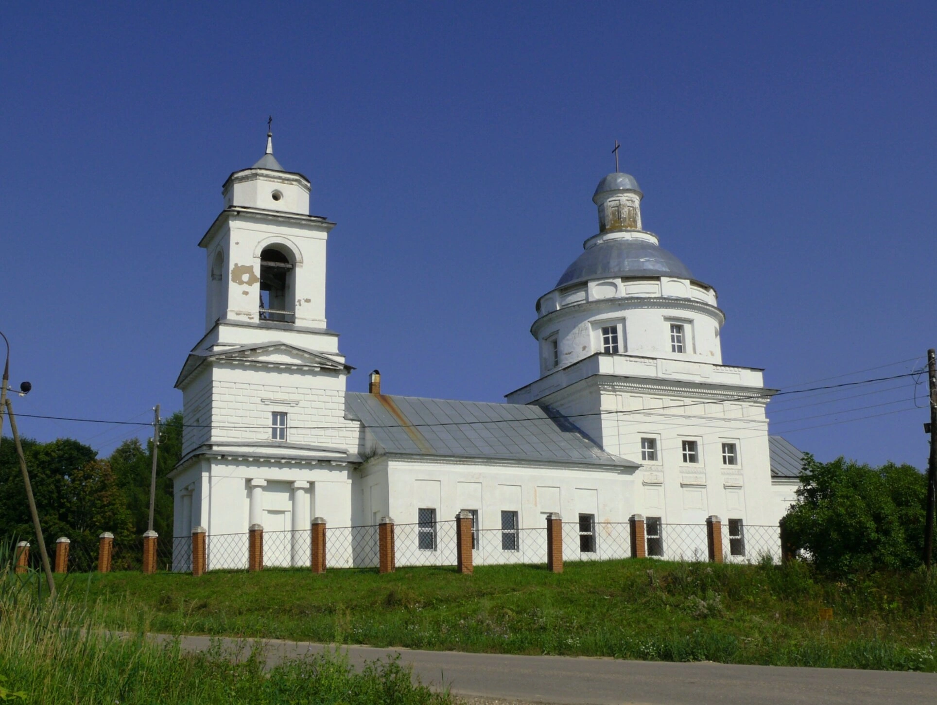 Каменный храм в стиле классицизма был возведен в 1807 году по личному проекту владельца села — князя Михаила Александровича Шаховского. Основной объем представляет собой бесстолпный двусветный четверик с одной апсидой, увенчанный массивным световым барабаном. Фасады здания обрамлены изящными филенками, а четверик завершен развитым дорическим антаблементом, что свидетельствует о высоком мастерстве архитектора.