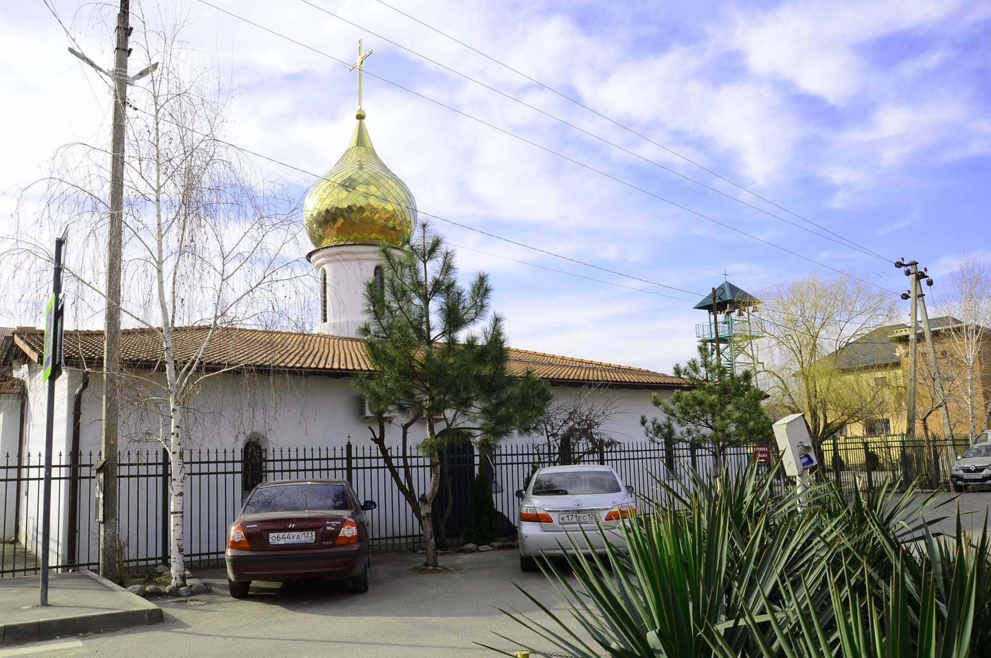 Архитектура храма выдержана в традиционном русско-византийском стиле, что подчёркивает его каноническое предназначение для совершения богослужений. Рядом с основным объёмом просматривается колокольня, являющаяся неотъемлемой частью церковного ансамбля. Присутствующие на фото элементы городской инфраструктуры, такие как опоры электропередач, гармонично соседствуют со святыней, иллюстрируя единство духовной и повседневной жизни.