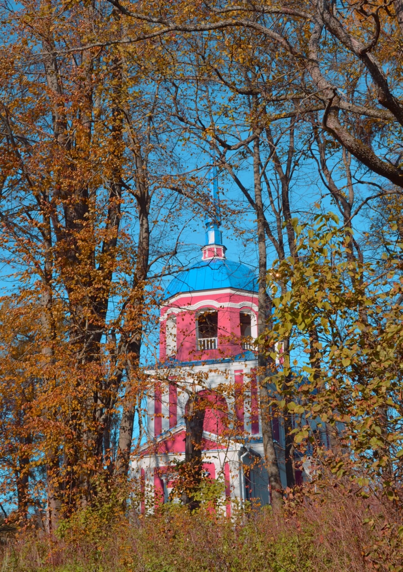 На представленной фотографии запечатлена Церковь Воскресения Христова, что располагается в старинной деревне Прутня Торжокского района Тверской области. Храм, частично укрытый золотистой осенней листвой, предстаёт перед зрителем в своём тихом величии. Ярко-синяя глава купола, увенчанная православным крестом, устремляется в небесную высь, символизируя молитвенное предстояние Богу. Стены тёплого красного кирпича, украшенные белоснежными декоративными элементами и оконными наличниками, свидетельствуют о традициях русского церковного зодчества.