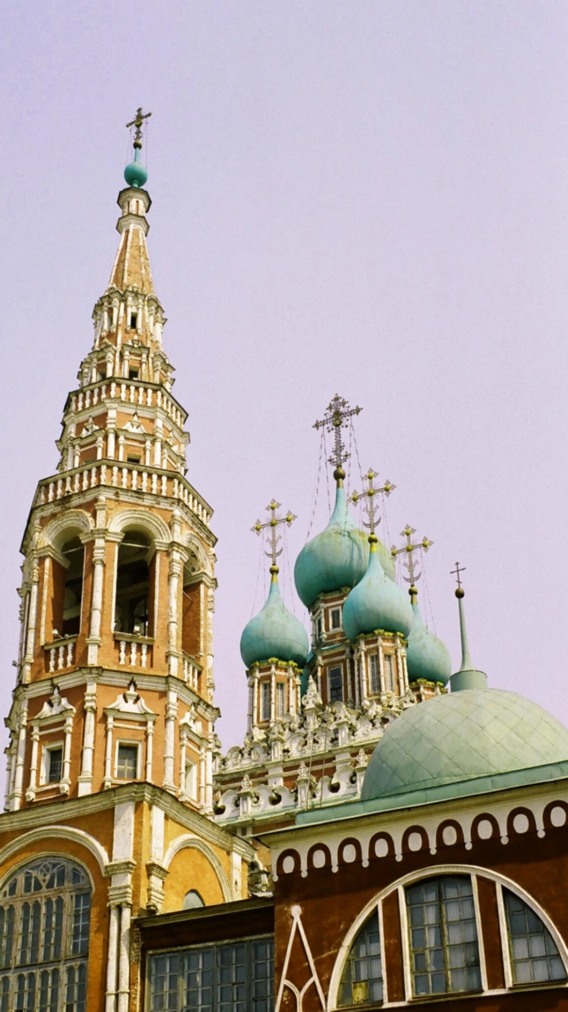 На представленной фотографии запечатлен величественный облик храма Воскресения Христова в Кадашах, одного из наиболее выразительных памятников московского зодчества. Колокольня храма, выполненная в стиле московского барокко, возносится к небу своими стройными ярусами. Арочные проемы звона украшены белокаменными наличниками, которые эффектно контрастируют с краснокирпичными стенами. Венчает колокольню изящный шпиль с православным крестом, символизирующим победу жизни над смертью.