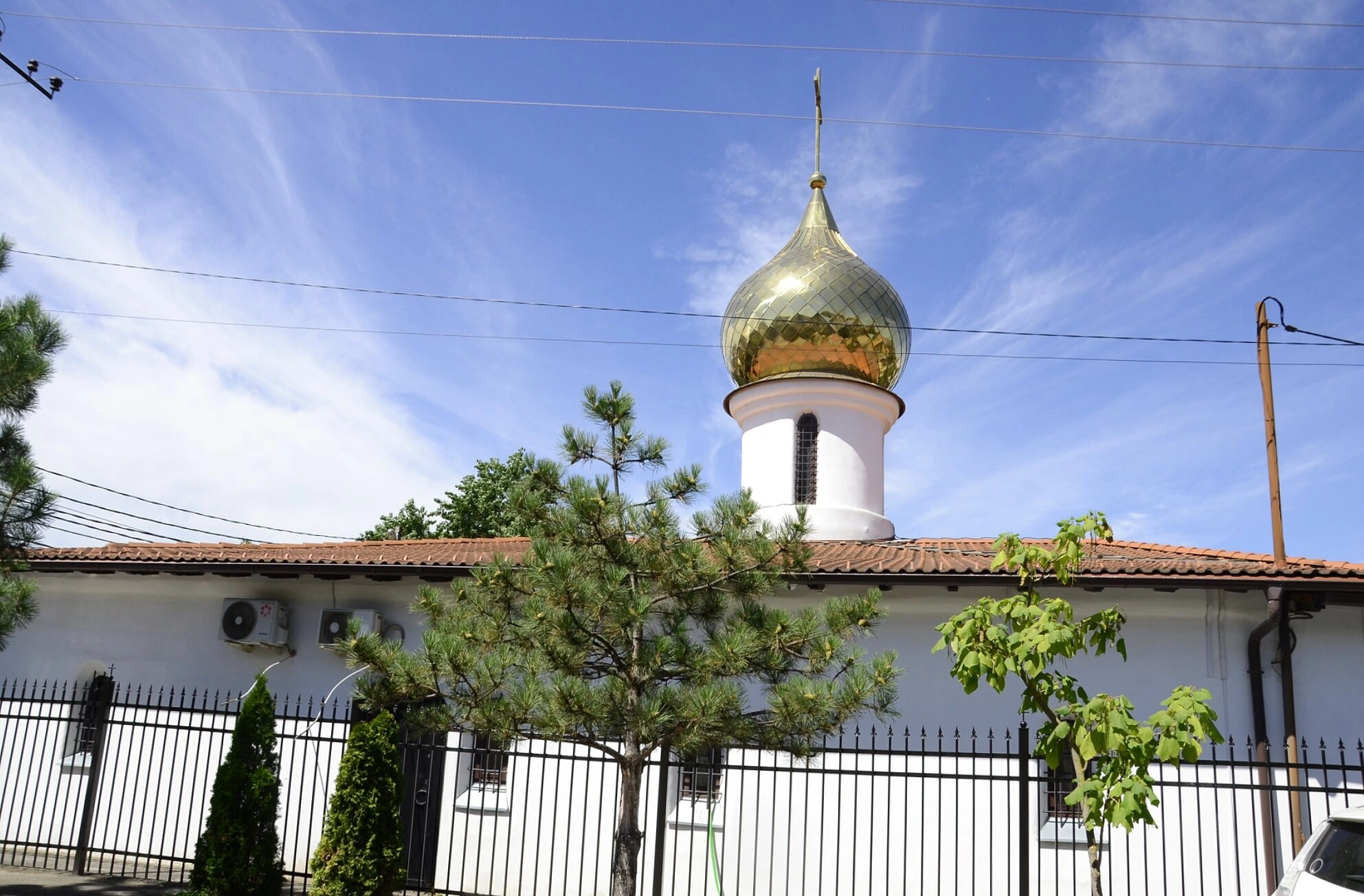 Перед храмом установлен кованый оградительный забор, обеспечивающий благочинную атмосферу для молитвенного уединения. На переднем плане фотографии виднеется хвойное дерево, что символически напоминает о вечной жизни, дарованной через Воскресение Христово. На заднем плане открывается светло-голубое небо с лёгкими облаками, создающее ощущение божественного присутствия и благословения.