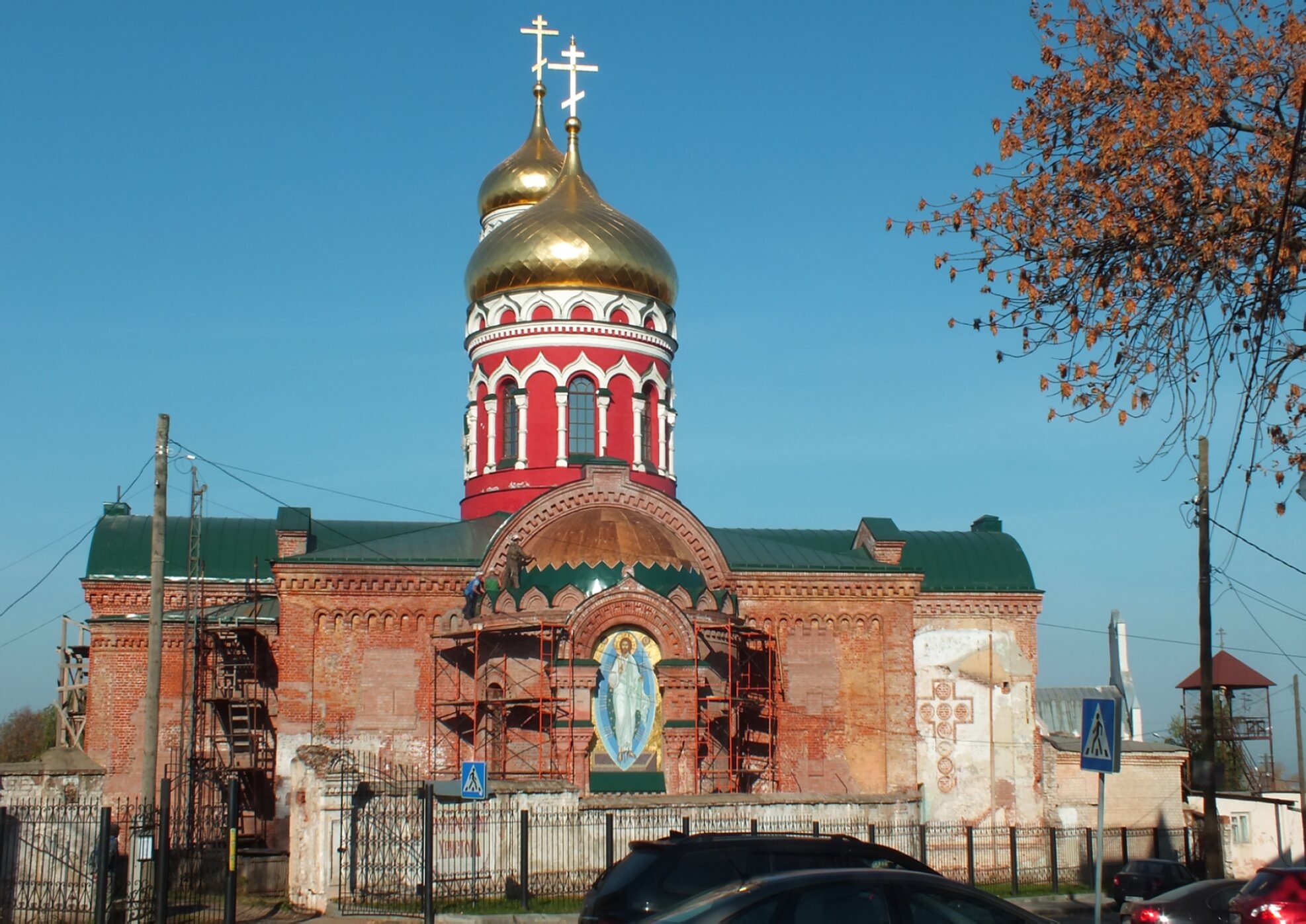 На представленной фотографии запечатлён старинный храм в честь Воскресения Христова, расположенный в исторической части Нижнего Новгорода. Это пятиглавое сооружение, увенчанное золотыми куполами-луковками, которые символизируют Господа Иисуса Христа и четырёх евангелистов. Стены церкви выложены из красного кирпича, что является характерным для русского храмового зодчества конца XIX века.