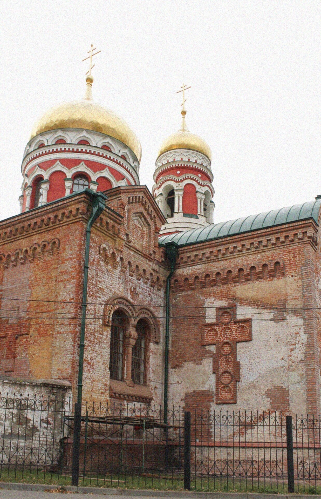 На фотографии запечатлена Церковь Воскресения Христова, расположенная в исторической Ямской слободе Нижнего Новгорода по адресу улица Шевченко, дом 1а. Этот православный храм, являющийся объектом культурного наследия регионального значения, демонстрирует величественную красоту русского стиля в церковной архитектуре. Основной объем здания выполнен из красного кирпича с изящным кирпичным декором, не покрытым штукатуркой, что создает уникальный и строгий облик. Венчают храм золоченые купола, сияющие в лучах солнца.