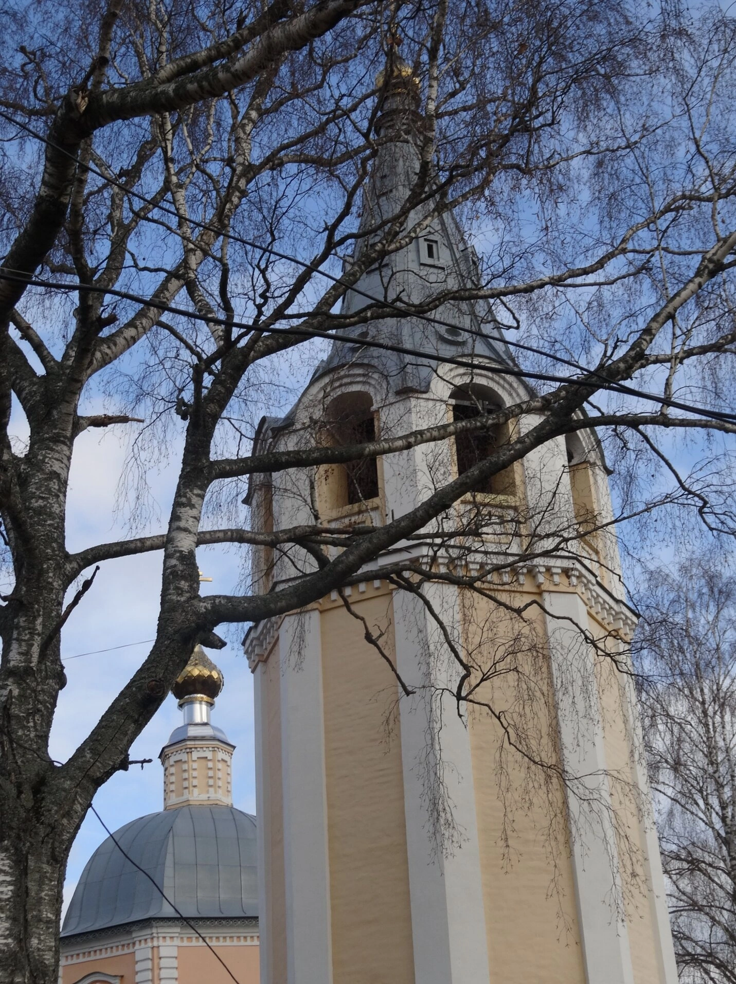 Центром композиции является высокая многоярусная колокольня, увенчанная небольшой главкой. Её стройный силуэт доминирует в кадре, говоря о назначении храма звать верующих на богослужение своим колокольным звоном. В нижней части фотографии виден золотистый купол, сияющий на солнце. Этот купол венчает основной объём церкви, а его луковичная форма и цвет традиционны для русского православного зодчества и обозначают небесную славу и горний мир.