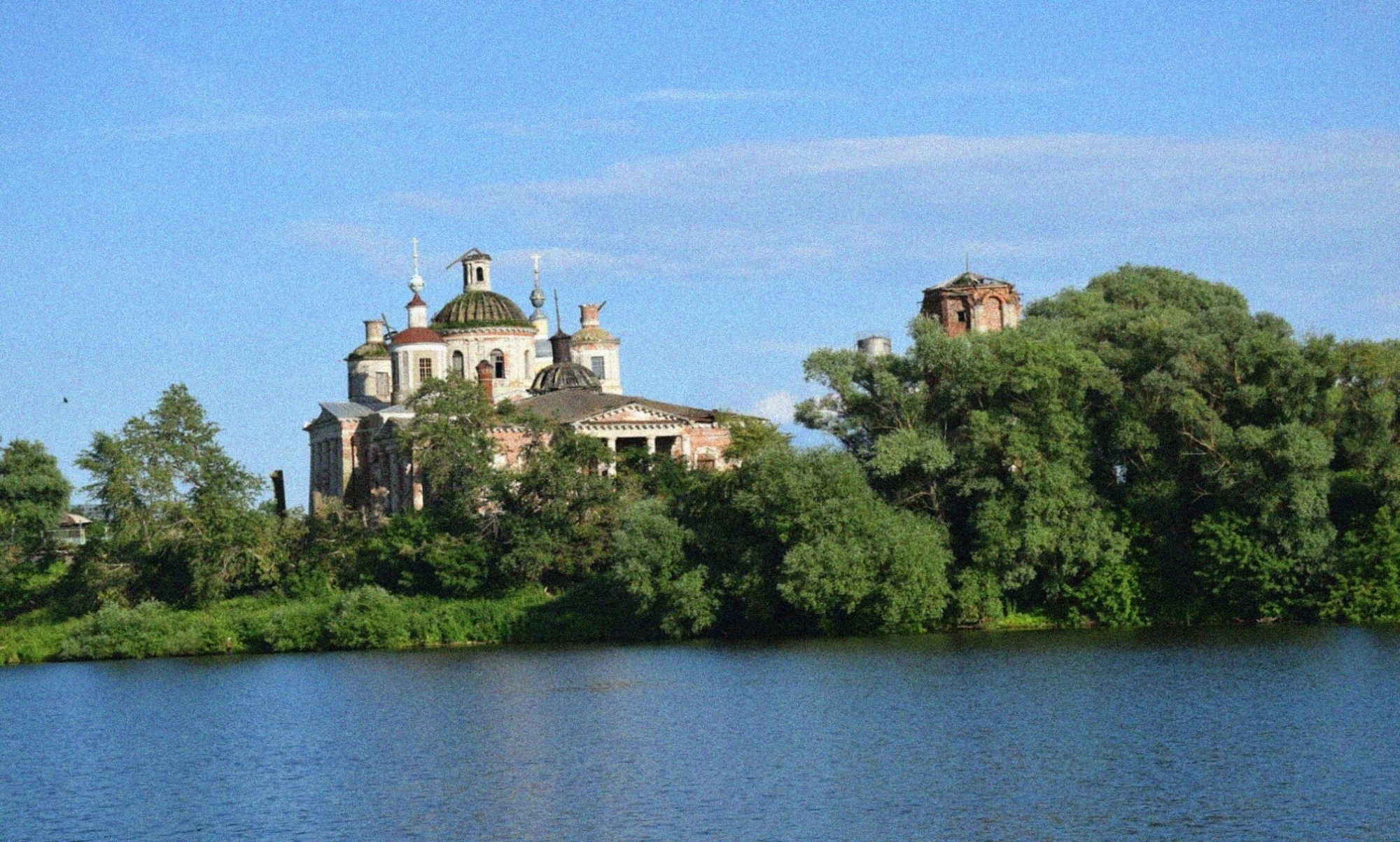 На заднем плане открывается вид на голубое небо с редкими облаками, что подчёркивает красоту Божьего мира и творения. Этот храм является не только архитектурным достоянием, но и духовным центром, свидетельствующим о вере и традициях наших предков.