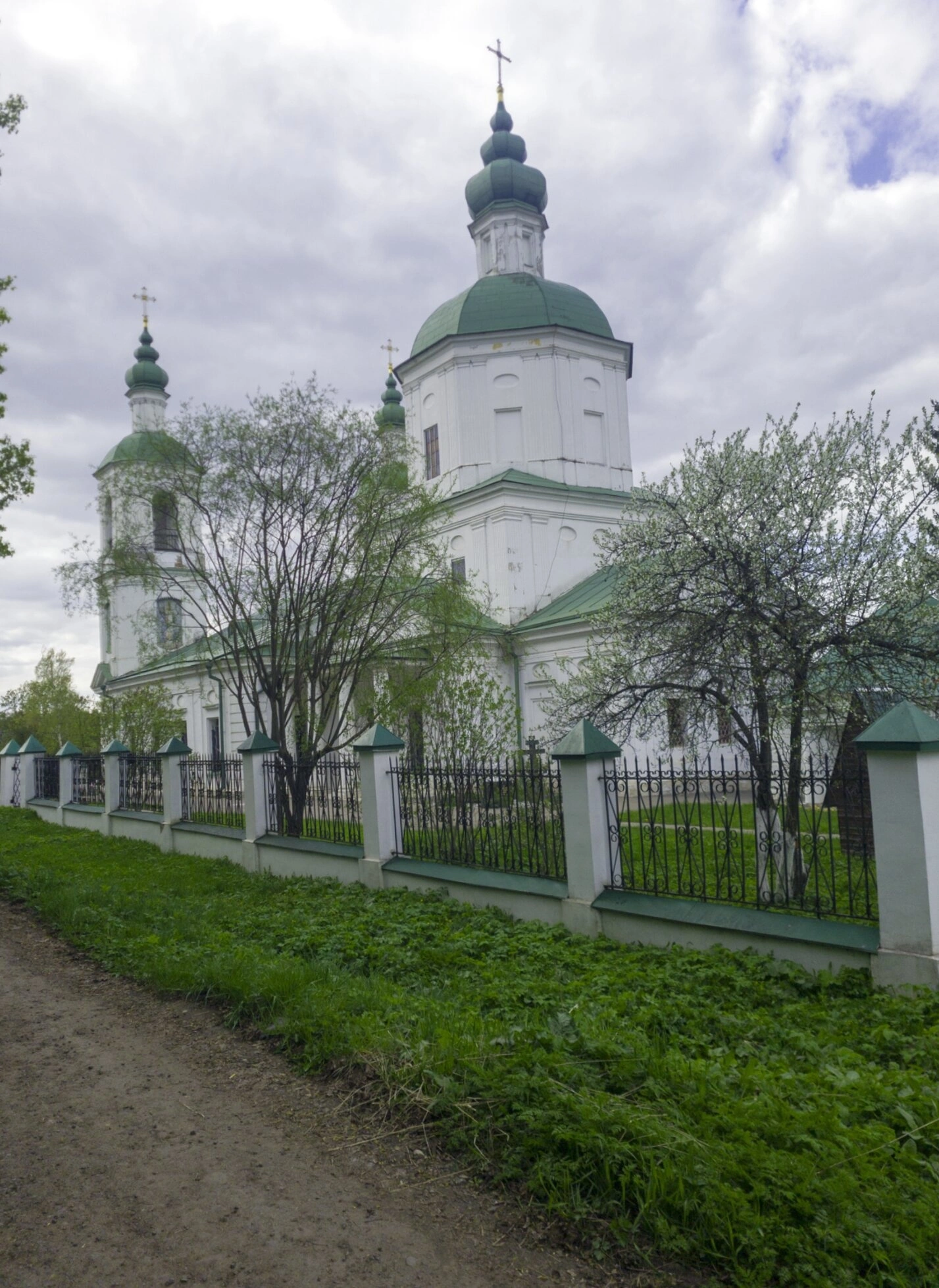 На снимке хорошо просматривается симметричная композиция здания, характерная для церковной архитектуры своего времени. К центральному объёму храма примыкает трапезная и многоярусная колокольня, увенчанная шпилем. Особое внимание привлекают главки, окрашенные в зелёный цвет, что символизирует жизнь и вечное обновление во Христе. Территория вокруг благоустроена: виднеется аккуратная металлическая ограда с белыми столбами и грунтовая дорожка, ведущая к святому месту.