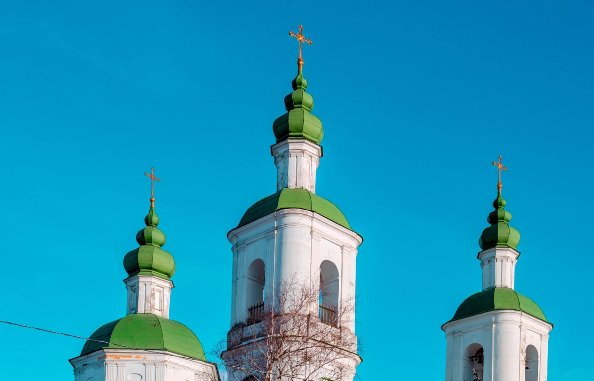 На фотографии запечатлён величественный вид храма Воскресения Христова, что расположен в исторической усадьбе Молоди. На фоне чистого голубого неба возносятся к небесам его ослепительно белые стены, увенчанные зелёными куполами и сияющими на солнце золотыми православными крестами. Центральная глава, самая высокая, символизирует Господа Иисуса Христа, в то время как окружающие её малые главы посвящены евангелистам или святым.
