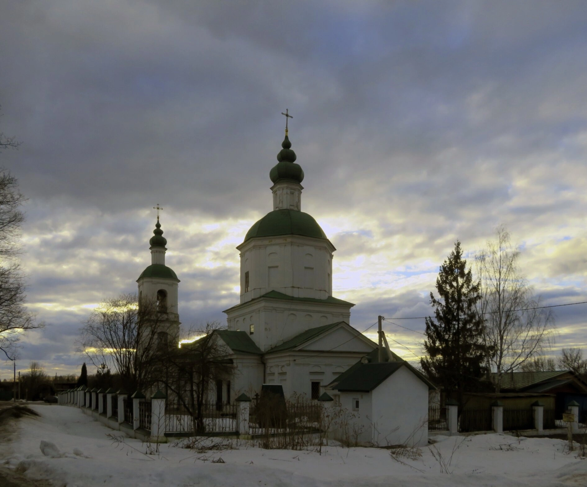 Белокаменный храм с зелёными куполами, увенчанными златоглавыми крестами, сияет в лучах закатного солнца, пробивающихся сквозь тяжёлые облака. Этот свет воспринимается как символ Божественной благодати, озаряющей мир. Архитектура церкви представляет собой прекрасный образец русского церковного зодчества, восходящего к лучшим традициям XVII-XVIII веков. Комплекс включает в себя основной объём, трапезную и высокую шатровую колокольню, что является характерным для храмового строительства того времени.