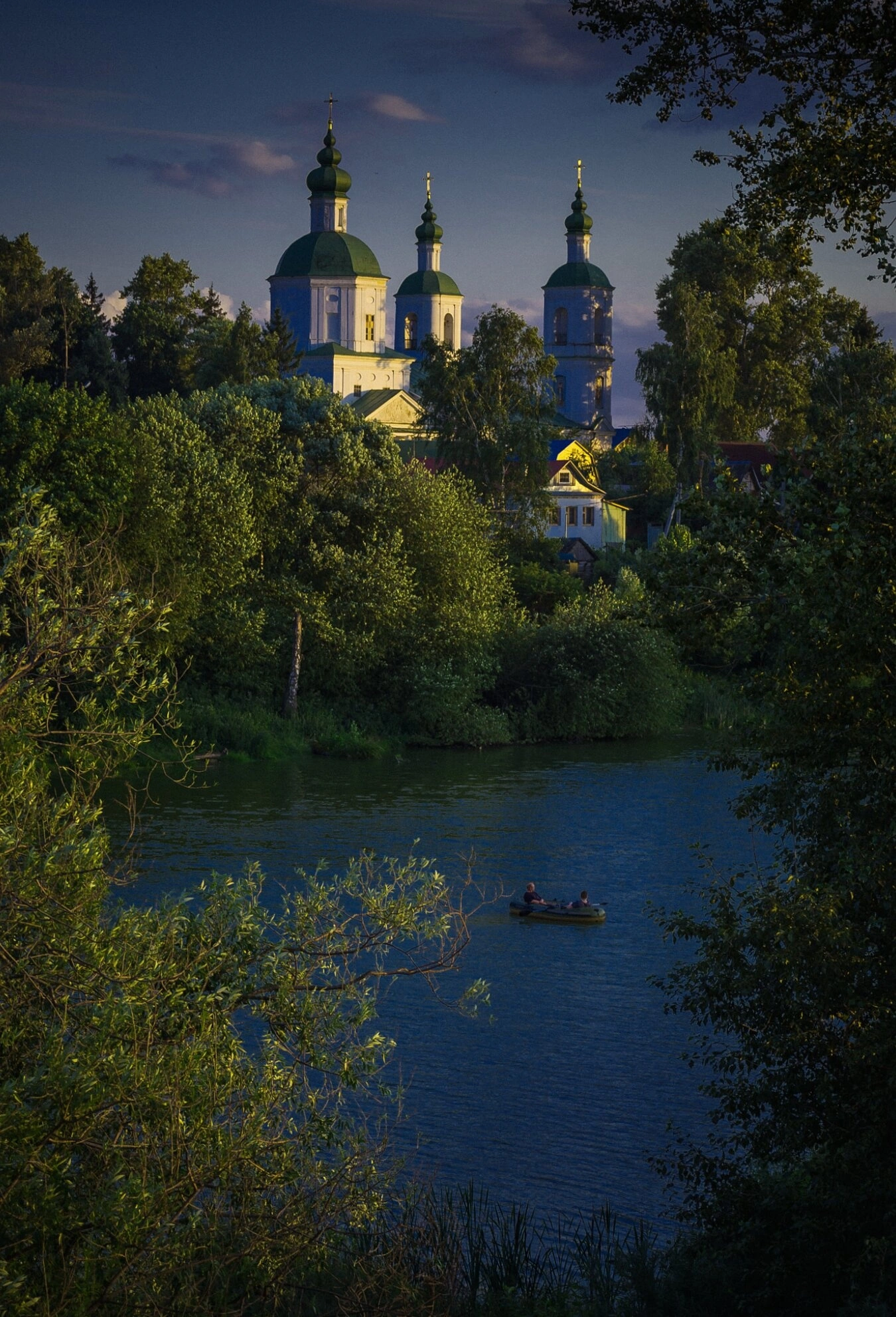 Освящение престола во имя Воскресения Христова придаёт этому месту особую сакральную значимость, напоминая верующим о победе жизни над смертью. На переднем плане фотографии видна лодка с людьми, что добавляет снимку ощущение мирной, созерцательной жизни, протекающей под сенью святого храма. Мягкий вечерний свет подчеркивает благодатную красоту этого места, где небо встречается с землёй, а история — с вечностью.