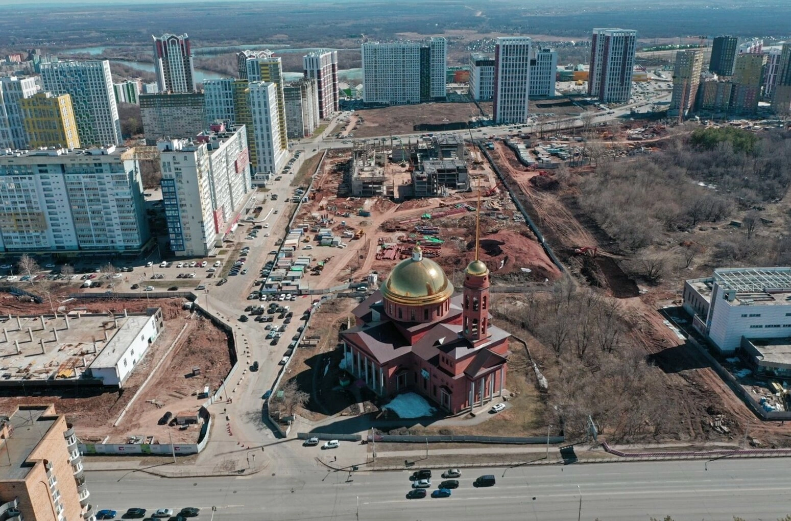 Вокруг храма раскинулся новый жилой микрорайон, состоящий из многоэтажных зданий. На переднем плане и в непосредственной близости от церковных стен видны участки, осваиваемые застройщиками, что подчёркивает активное развитие данной части города. Присутствующая на фото строительная техника и незавершённые объекты символизируют преемственность поколений и непрерывное созидание, в центре которого остаётся дом молитвы.