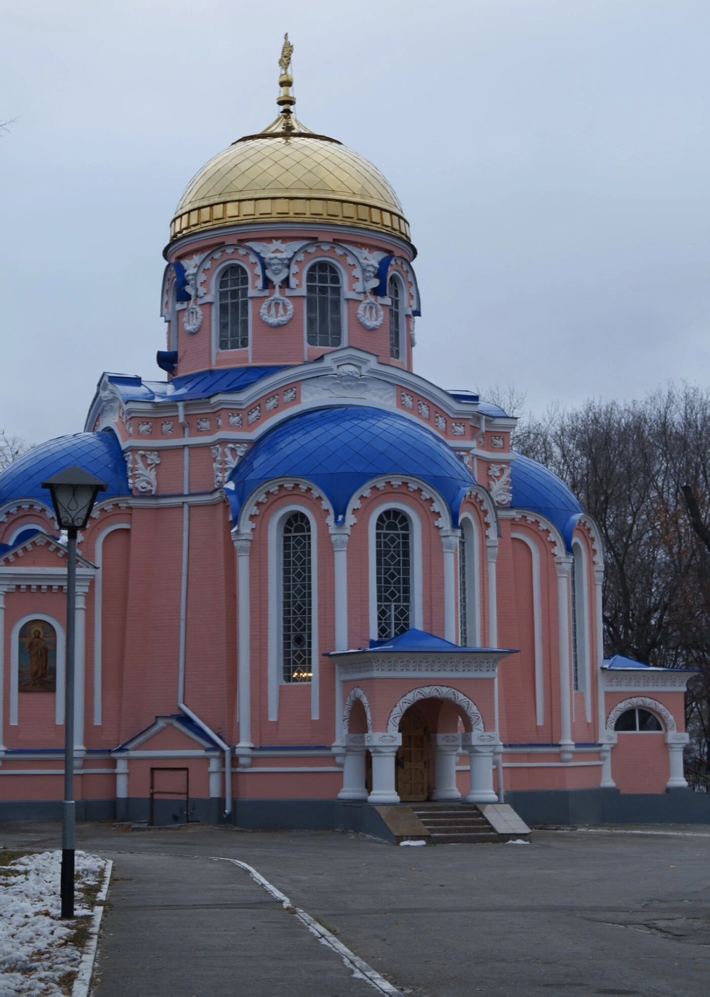 На представленной фотографии запечатлён величественный Храм Воскресения Христова, расположенный в городе Ульяновске. Святыня возведена в традициях русско-византийского стиля, что подчёркивает преемственность древних церковных архитектурных традиций. Основной объём храма окрашен в благородный персиково-розовый цвет, который гармонично сочетается с изящными белоснежными декоративными элементами.