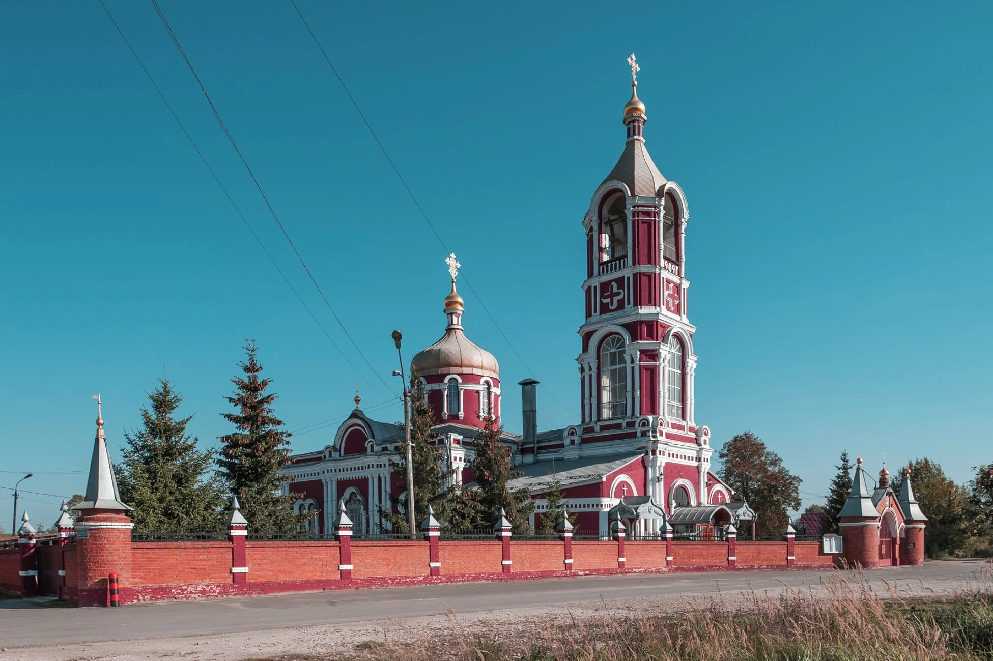 На фотографии храм изображён в ясный солнечный день. Лучи солнца подчёркивают красоту церковной архитектуры и создают игру света на позолоченных куполах, которые ярко сияют на фоне голубого неба. Зелёные хвойные деревья, окружающие церковь, обрамляют её и дополняют живописный вид.