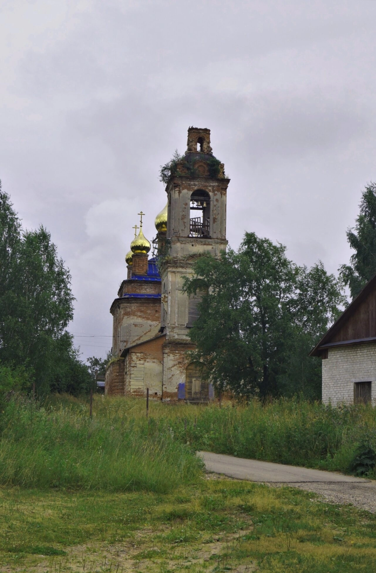 Окружающий пейзаж дополняет образ заброшенности: высокая зелёная трава, густые деревья, заросшая дорожка, ведущая к храму. Пасмурное небо с серыми облаками усиливает впечатление уединённости и скорби о былом величии этой святыни.