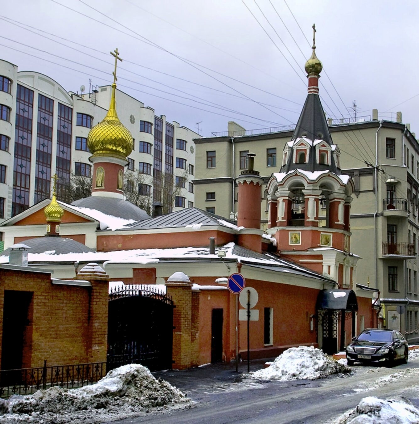 Снимок выполнен в зимний период, что подчёркивается снежным покровом на земле, кровле храма и окружающих строениях. Морозный воздух и мягкий свет создают особую атмосферу благоговения и покоя, свойственную древним московским святыням. Архитектурный облик храма, сложившийся в XIX веке, представляет собой образец русской церковной архитектуры, гармонично вписанной в городской ландшафт.