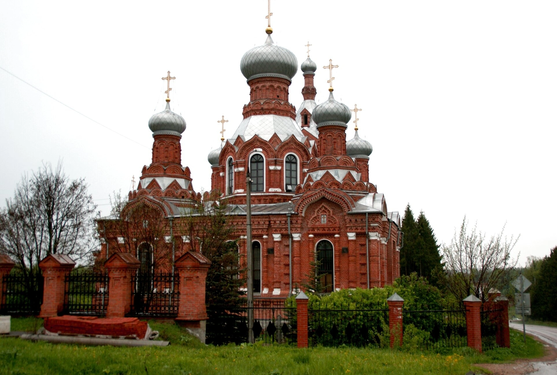 На представленной фотографии запечатлен величественный Крестовоздвиженский храм, расположенный в живописном селе Дарна Истринского района Московской области. Это пятиглавое кирпичное здание, возведенное в 1895–1900 годах по проекту известного архитектора Сергея Владимировича Шервуда в духе эклектики с преобладанием псевдорусского стиля. Храм был выстроен на средства прихожан и благотворителей на месте сгоревшей деревянной церкви.