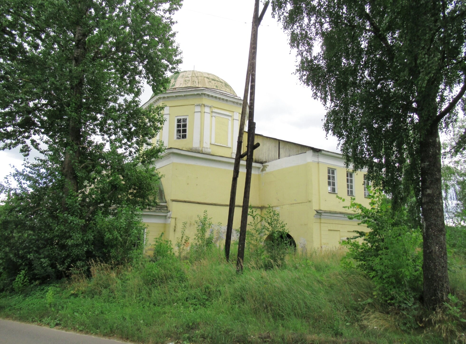Снимок сделан с уровня земли, что позволяет зрителю ощутить себя стоящим у подножия храма. На переднем плане видна грунтовая дорога, ведущая к церковным вратам, а рядом возвышается опора линии электропередачи, являющаяся знаком современности, соседствующей с вечной благодатью дома Божьего. Данный ракурс передаёт не только архитектурные особенности храма, но и его естественную среду, показывая, как святыня освящает собой всё пространство вокруг.