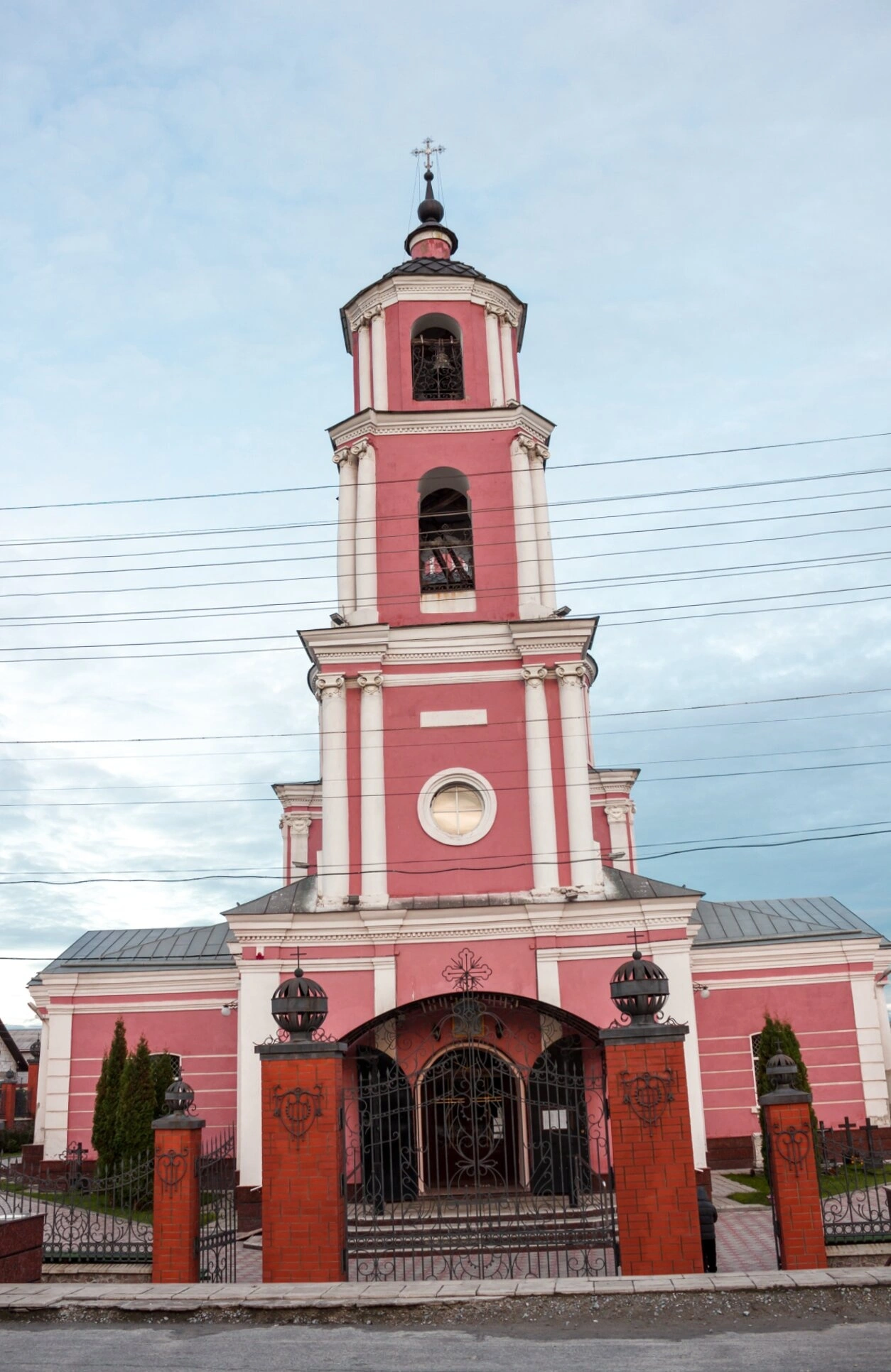 Храм отличается строгими и благородными архитектурными формами, характерными для русского церковного зодчества. Фасад здания окрашен в тёплый розовый цвет, который гармонично сочетается с белоснежными декоративными элементами: колоннами, обрамлением окон и карнизами. Над основным объёмом возвышается массивный купол, увенчанный золочёным крестом, сияющим под лучами солнца. Рядом высится ярусная колокольня, завершающая целостный и гармоничный образ святыни.