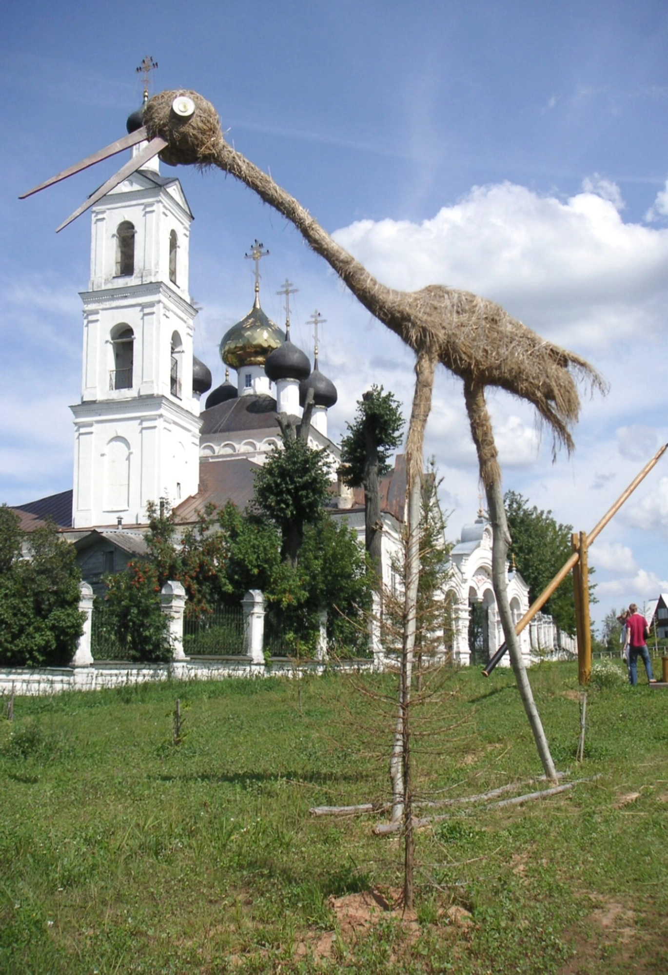 Белоснежный объем церкви с зелёной кровлей и изящной главкой-луковкой, увенчанной золочёным крестом, представляет собой образец русского церковного зодчества. На переднем плане фотографии внимание привлекает искусно выполненная скульптура аиста, сплетённая из соломы, что символизирует мирную жизнь и благоустройство территории силами местных жителей и прихожан.