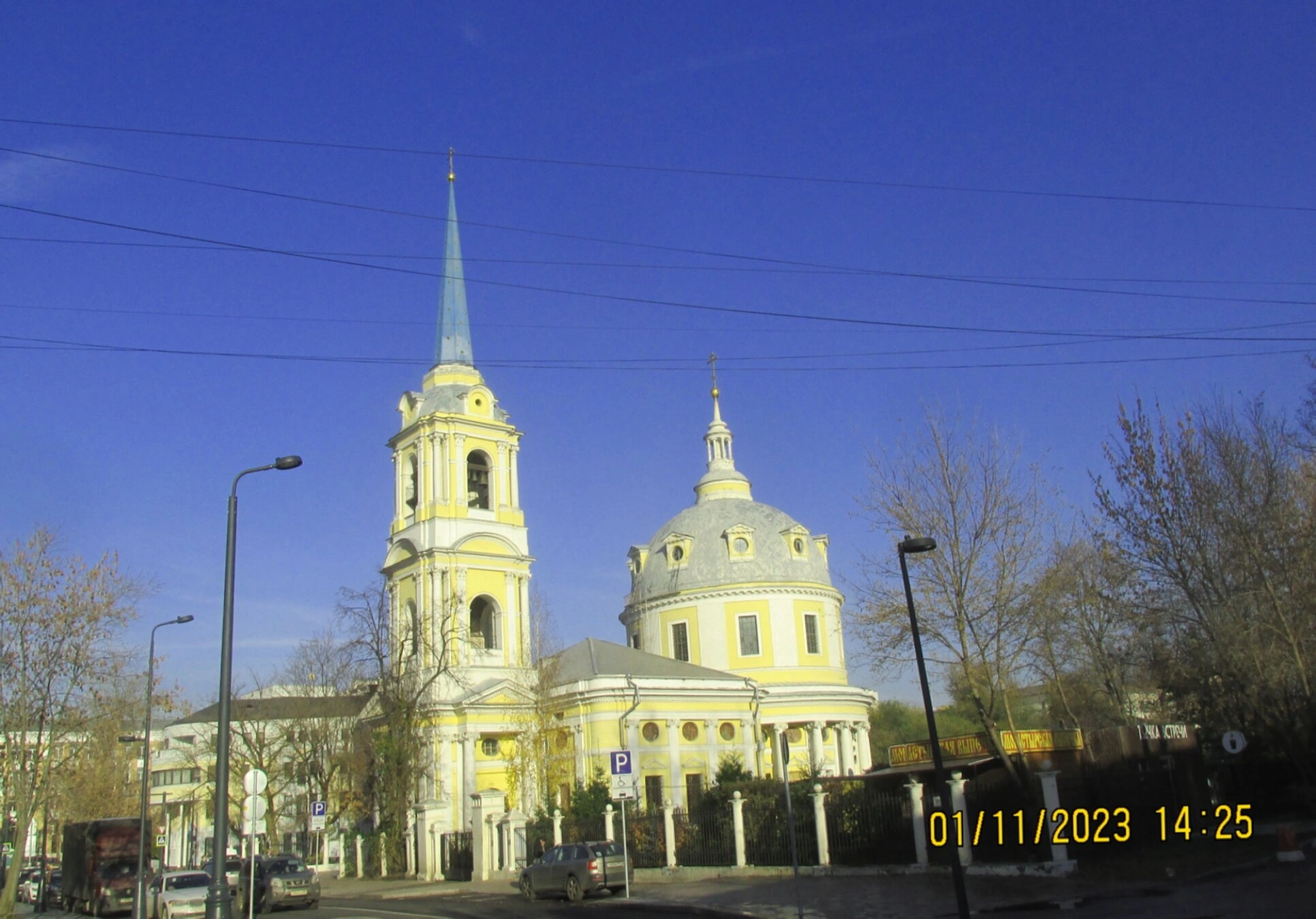 Фотография сделана в погожий день, о чем свидетельствует чистое голубое небо и яркое солнечное освещение, подчеркивающее детали фасада. Храм запечатлен в своей обыденной, но живой городской среде: перед белым ограждением с решетками проходит дорога, видны уличные фонари и деревья. Отсутствие листвы на деревьях указывает на позднеосенний или зимний период, а штамп в углу снимка точно фиксирует дату — 1 ноября 2023 года. Крупным планом люди на фотографии отсутствуют, что позволяет в полной мере сосредоточиться на архитектурном совершенстве святыни.