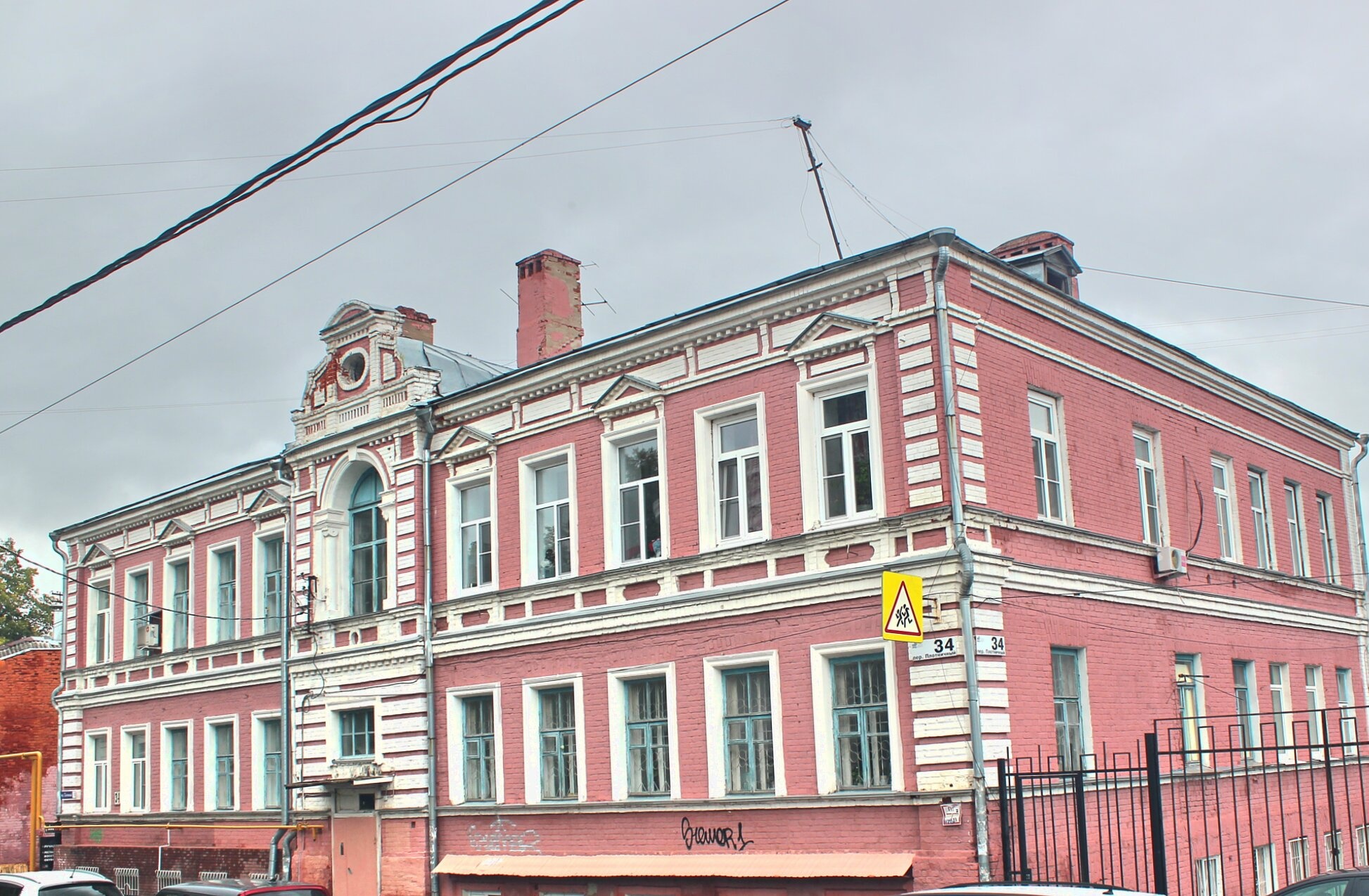 На представленной фотографии запечатлён старинный двухэтажный храм в честь Вознесения Господня, расположенный в исторической части Нижнего Новгорода, на улице Ильинской, в доме №34. Здание, сложенное из благородного розового кирпича и украшенное изящными белыми декоративными элементами, является выдающимся памятником церковной архитектуры.