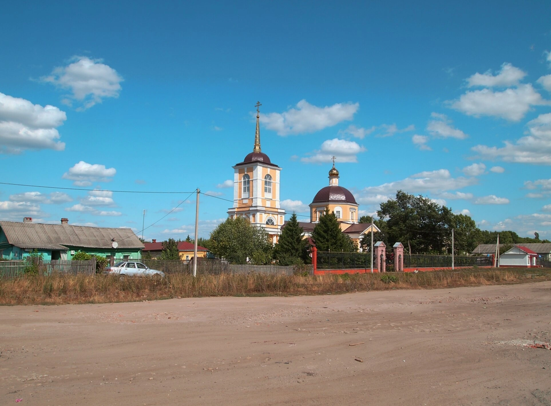 На фотографии запечатлён вид на Свято-Вознесенский храм в городе Аркадаке Саратовской области. Снимок сделан в летний день, и на нём предстаёт благолепный образ церкви, возносящей к небу свои главки с золотыми крестами. Храм, окружённый невысокой оградой и зеленью деревьев, возвышается над одноэтажными домами, являясь духовным центром и архитектурной доминантой этого места. Чистое голубое небо с облаками подчёркивает торжественность и светлый настрой образа.
