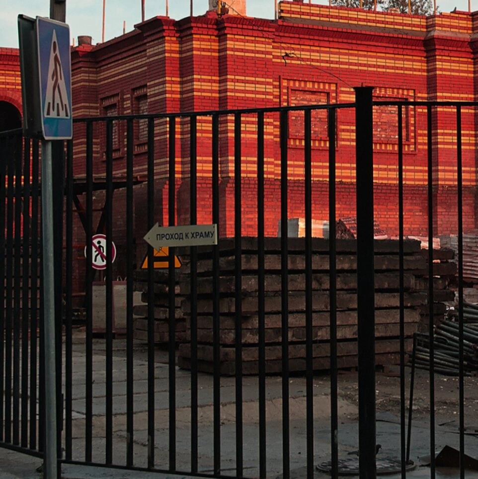 Территория вокруг храма ограждена кованым металлическим забором чёрного цвета, обеспечивающим сохранность и уединённость священного пространства. На переднем плане фотографии виден дорожный знак, обозначающий пешеходный переход, что свидетельствует о заботе о безопасности прихожан. Установленный указатель с надписью «ПРОХОД К ХРАМУ» направляет верующих к месту молитвы.
